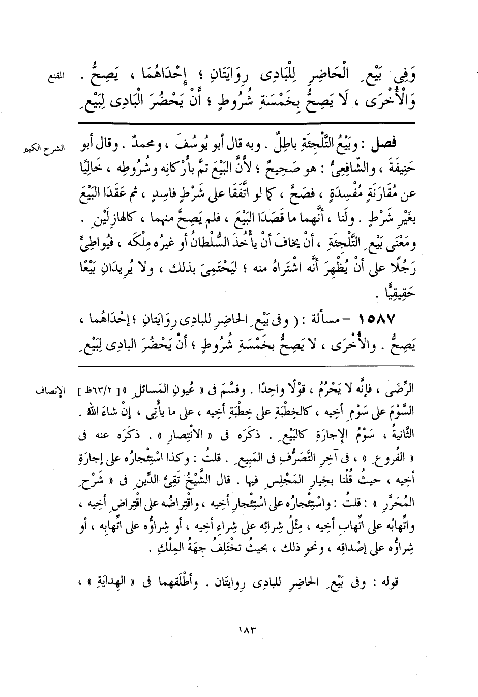 وَفِى بَيْعِ الْحَاضِرِ لِلْبَادِى رِوَايَتَانِ؛ إِحْدَاهُمَا، يَصِحُّ. وَالأُخْرَى، لَا يَصِحُّ بِخَمْسَةِ شُرُوطٍ؛ أَنْ يَحْضُرَ الْبَادِى لِبَيْعِ