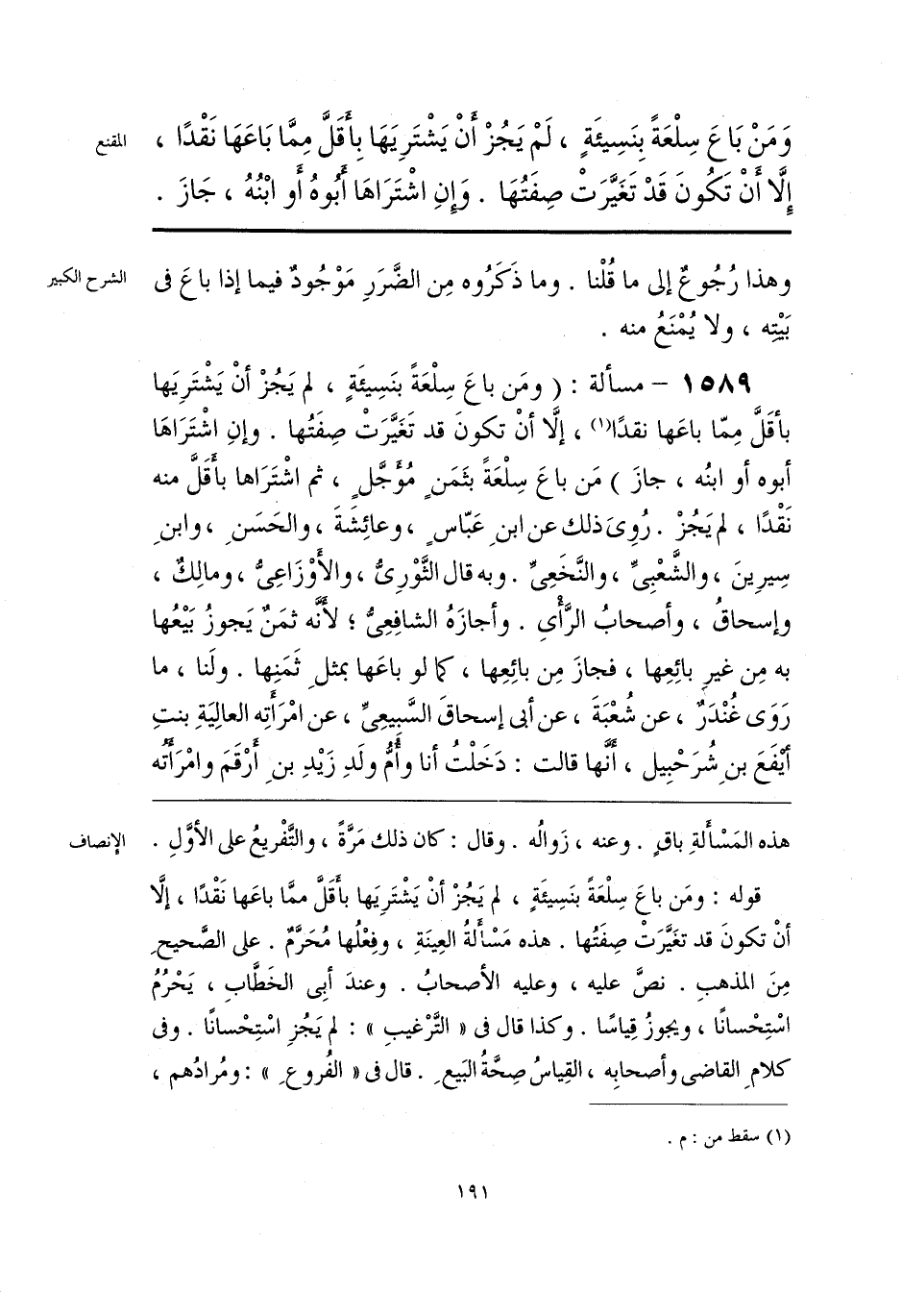 وَمَنْ بَاعَ سِلْعَةً بِنَسِيئَةٍ، لَمْ يَجُزْ أَنْ يَشْتَرِيَهَا بِأَقَلَّ مِمَّا بَاعَهَا نَقْدًا، إِلَّا أَنْ تَكُونَ قَدْ تَغَيَّرَتْ صِفَتُهَا. وَإِنِ اشْتَرَاهَا أَبُوهُ أَو ابْنُهُ، جَازَ.