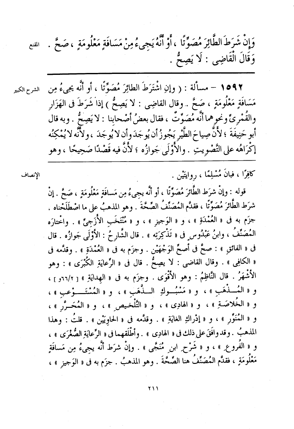 قوله: وإنْ شرَط الطَّائرَ مُصَوِّتًا، أو أنَّه يجِئُ مِن مَسافَةٍ مَعْلُومَةٍ، صَحَّ. إنْ شرَط الطَّائرَ مُصَوِّتًا، فقدَّم المُصَنِّفُ الصِّحَّةَ. وهو المذهبُ على ما اصْطَلَحْناه: جزَم به فى «العُمْدَةِ»، و «الوَجيزِ»، و «مُنْتَخَبِ الأزَجِى». واخْتارَه المُصَنِّفُ، وابنُ عَبْدُوسٍ فى «تَذْكِرَتِه». قال الشَّارِحُ: الأوْلَى جَوازُه. قال فى «الفائقِ»: صحَّ فى أصحِّ الوَجْهَيْن. وجزَم به فى «العُمْدَةِ». وقدَّمه فى «الكافِى». وقال القاضى: لا يصِحُّ. قال فى «الرِّعايَةِ الكُبْرَى»: وهو الأشْهَرُ. قال النَّاظِمُ: وهو الأقْوَى. وجزَم به فى «الهِدايَةِ»، و «المُذْهَبِ»، و «مَسْبُوكِ الذَّهَبِ»، و «المُسْتَوْعبِ»، و «الخُلاصَةِ»، و «الهادِى»، و «التَّلْخيصِ»، و «المُحَرَّرِ»، و «المُنَوِّرِ»، و «إِدْراكِ الغايَةِ». وقدَّمه فى «الحاوِيَيْن». قلتُ: وهذا المذهبُ. وقد وافَقَ على ذلك فى «الهادِى». وأطْلَقهما فى «الرِّعايَةِ الصُّغْرَى»، و «الفُروعِ»، و «شَرْحِ ابنِ مُنَجَّى». وإنْ شرَط أنَّه يجِئُ مِن مَسافَةٍ مَعْلُومَةٍ، فقدَّم المُصَنِّفُ هنا الصِّحَّةَ. وهو المذهبُ. جزَم به فى «الوَجيزِ»،