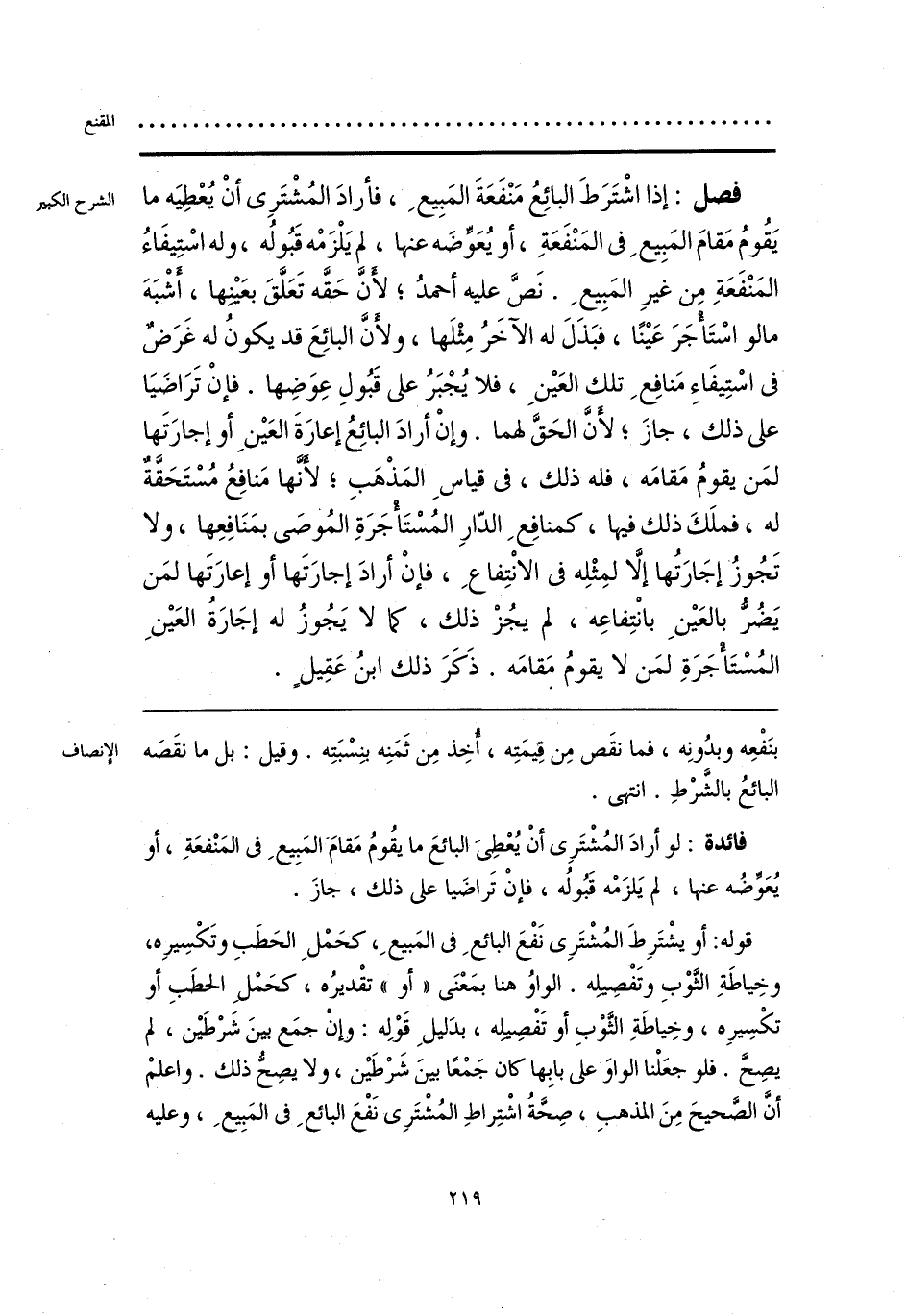 قوله: أو يشْتَرِطَ المُشْتَرِى نَفْعَ البائعِ فى المَبيعِ، كحَمْلِ الحَطَبِ وتَكْسِيرِه، وخِياطَةِ الثَّوْبِ وتَفْصِييه. الواوُ هنا بمَعْنَى «أو» تقْديرُه، كحَمْلِ الحطَبِ أو تكْسِيرِه، وخِياطَةِ الثَّوْبِ أو تَفْصِيلِه، بدَليلِ قَوْلِه: وإنْ جمَع بينَ شَرْطَيْن، لم يصِحَّ. فلو جعَلْنا الواوَ على بابِها كان جَمْعًا بينَ شَرْطَيْن، ولا يصِحُّ ذلك. واعلمْ أنَّ الصَّحيحَ مِنَ المذهبِ، صِحَّةُ اشْتِراطِ المُشْتَرِى نَفْعَ البائعِ فى المَبِيعِ، وعليه