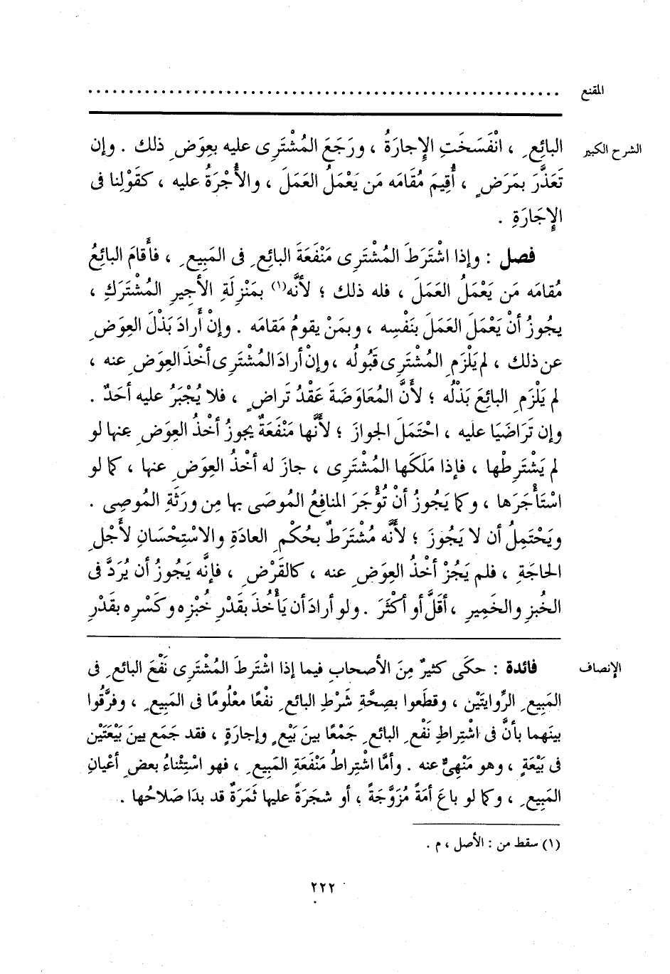 فائدة: حكَى كثيرٌ مِنَ الأصحابِ فيما إذا اشْتَرطَ المُشْتَرِى نَفعَ البائعِ فى المَبِيعِ الرِّوايتَيْن، وقطَعوا بصِحَّة شَرْطِ البائعِ نفْعًا معْلُومًا فى المَبِيع، وفرَّقُوا بينَهما بأنَّ فى اشْتِراطِ نَفْعِ البائعِ جَمْعًا بينَ بَيْعٍ وإجارَةٍ، فقد جَمَع بينَ بَيْعَتَيْن فى بَيْعَةٍ، وهو مَنْهِىٌّ عنه. وأمَّا اشْتِراطُ مَنْفَعَةِ المَبِيعِ، فهو اسْتِثْناءُ بعض أعْيانِ المَبِيعِ، وكما لو باعَ أمَةً مُزَوَّجَةً؛ أو شجَرَةً عليها ثَمَرَةٌ قد بدَا صَلاحُها.