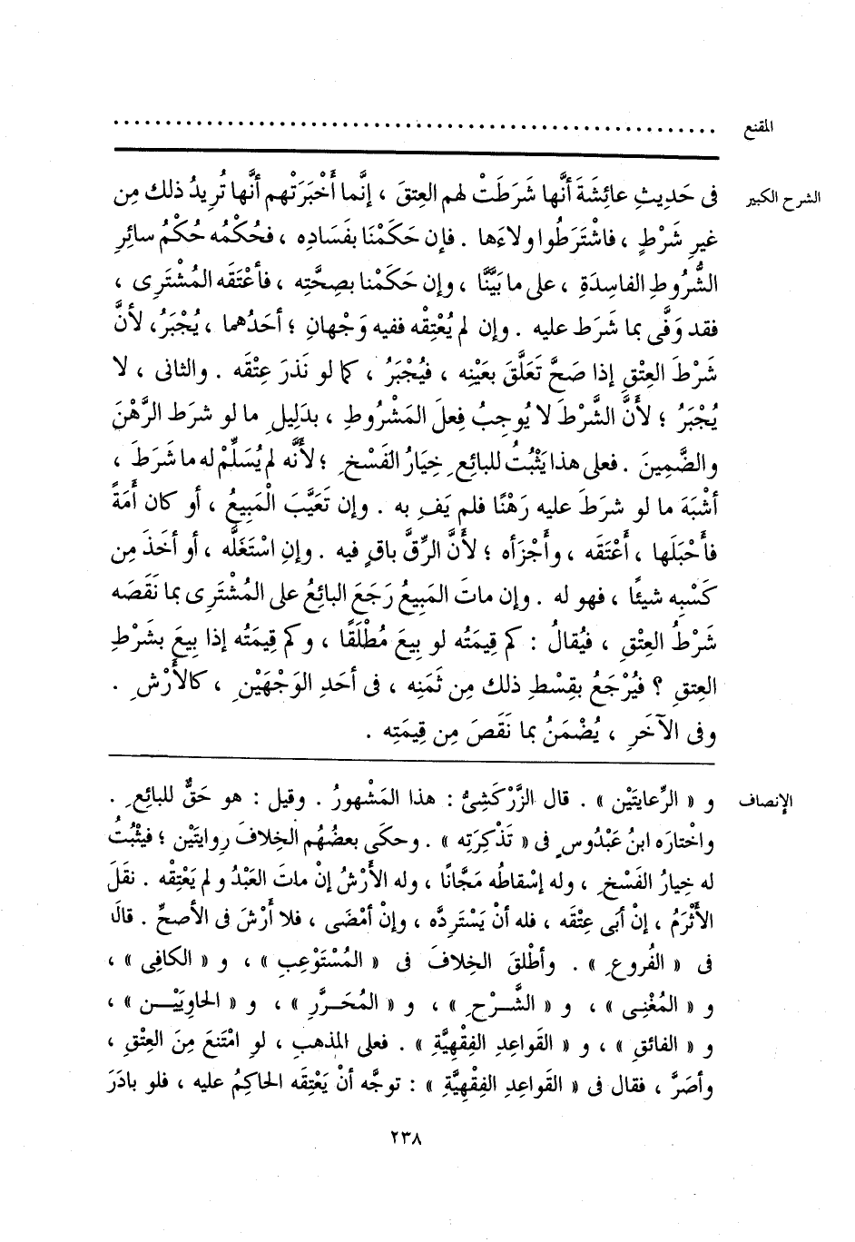 و «الرِّعايتَيْن». قال الزَّرْكَشِىُّ: هذا المَشْهورُ. وقيل: هو حَقٌّ للبائِع. واخْتارَه ابنُ عَبْدُوسٍ فى «تَذْكِرَتِه». وحكَى بعضُهُم الخِلافَ رِوايتَيْن؛ فيثْبُتُ له خِيارُ الفَسْخِ، وله إسْقاطُه مَجَّانًا، وله الأرْشُ إنْ ماتَ العَبْدُ ولم يَعْتِقه. نقَلَ الأَثْرَمُ، إنْ أَبَى عِتْقَه، فله أَنْ يَسْتَرِدَّه، وإنْ أمْضَى، فلا أرْشَ فى الأصحِّ. قالَ فى «الفُروعِ». وأطْلقَ الخِلافَ فى «المُسْتَوْعِبِ»، و «الكافِى»، و «المُغْنِى»، و «الشَّرْحِ»، و «المُحَرَّرِ»، و «الحاوِيَيْن»، و «الفائقِ»، و «القَواعِدِ الفِقْهِيَّةِ». فعلى المذهبِ، لوِ امْتَنعَ مِنَ العِتْقِ، وأصَرَّ، فقال فى «القَواعِدِ الفِقْهِيَّةِ»: توجَّه أَنْ يَعْتِقَه الحاكِمُ عليه، فلو بادَرَ