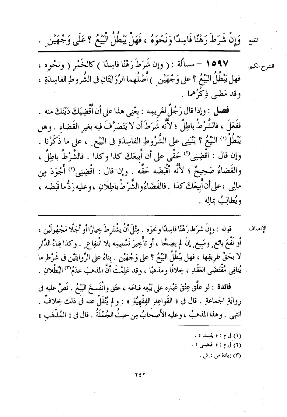 قوله: وِإنْ شرَط رَهْنًا فاسِدًا ونحوَه. مِثْلَ أَنْ يشْتَرِطَ خِيارًا أو أجَلًا مَجْهُولَيْن، أو نَفْعَ بائعٍ ومَبِيعٍ إنْ لم يصِحَّا، أو تأْخِيرَ تَسْلِيمِه بلا انْتفِاع. وكذا فِناءُ الدَّارِ لا بحَقِّ طرِيقِها، فهل يبْطُلُ البَيْعُ؟ على وَجْهَيْن. بناءً على الرِّوايتَيْن فى شَرْطِ ما يُنافِى مُقْتَضَى العَقْدِ، خِلافًا ومذهبًا، وقد عَلِمْتَ أَنَّ المذهبَ عدَمُ (¬1) البُطْلانِ.