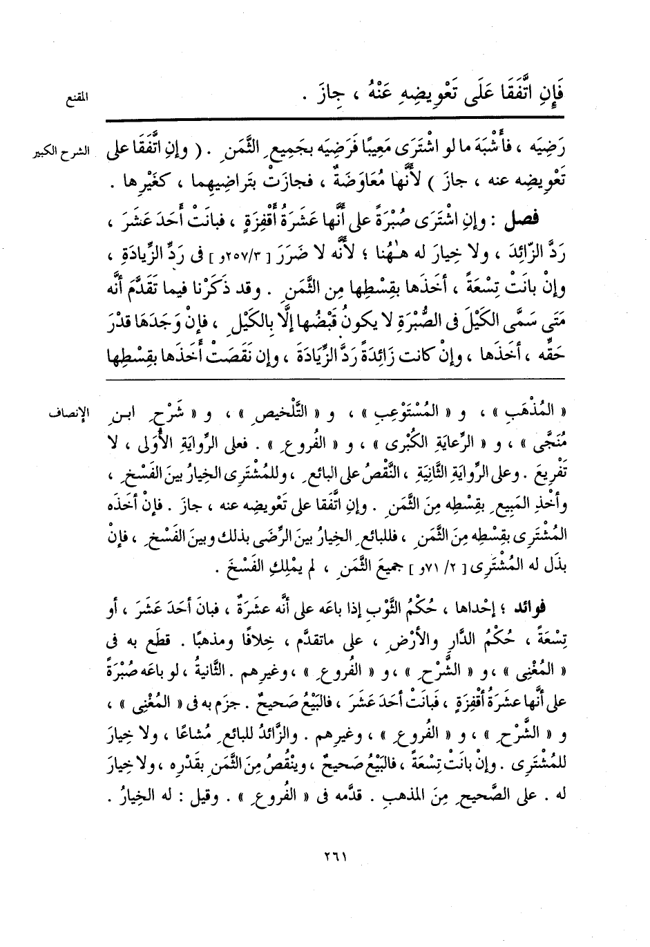«المُذْهَبِ»، و «المُسْتَوْعِبِ»، و «التَّلْخيصِ»، و «شَرْحِ ابنِ مُنَجَّى»، و «الرِّعايَةِ الكُبْرى»، و «الفُروعِ». فعلى الرِّوايَةِ الأُوَلى، لا تَفْرِيعَ. وعلى الرِّوايَةِ الثَّانِيَةِ، النَّقْصُ على البائعِ، وللمُشْتَرِى الخِيارُ بينَ الفَسْخِ، وأخْذِ المَبِيعِ بقِسْطِه مِنَ الثَّمَنِ. وإنِ اتَّفَقا على تَعْويضِه عنه، جازَ. فإنْ أخَذَه المُشْتَرِى بقِسْطِه مِنَ الثَّمَنِ، فللبائعِ الخِيارُ بينَ الرِّضَى بذلك وبينَ الفَسْخِ، فإنْ بذَل له المُشْتَرى جميعَ الثَّمَنِ، لم يمْلِكِ الفَسْخَ.