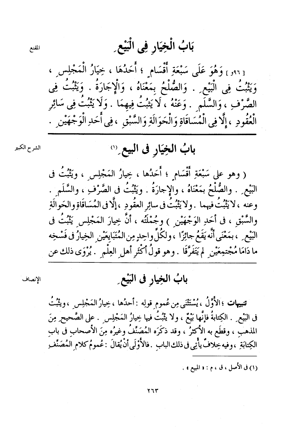 وَهُوَ عَلَى سَبْعَةِ أَقْسَامٍ؛ أَحَدُهَا، خِيَارُ الْمَجْلِسِ، وَيَثْبُت فى الْبَيْعِ. وَالصُّلْحُ بِمَعْنَاهُ، وَالإِجَارَةُ. وَيَثْبُت فى الصَّرْفِ، وَالسَّلَمِ. وَعَنْهُ، لَا يَثبُتُ فِيهِمَا. وَلَا يَثْبُتُ فى سَائِرِ الْعُقُودِ، إِلَّا فى الْمُسَاقَاةِ وَالْحَوَالَةِ وَالسَّبْقِ، فى أَحَدِ الْوَجْهَيْنِ.