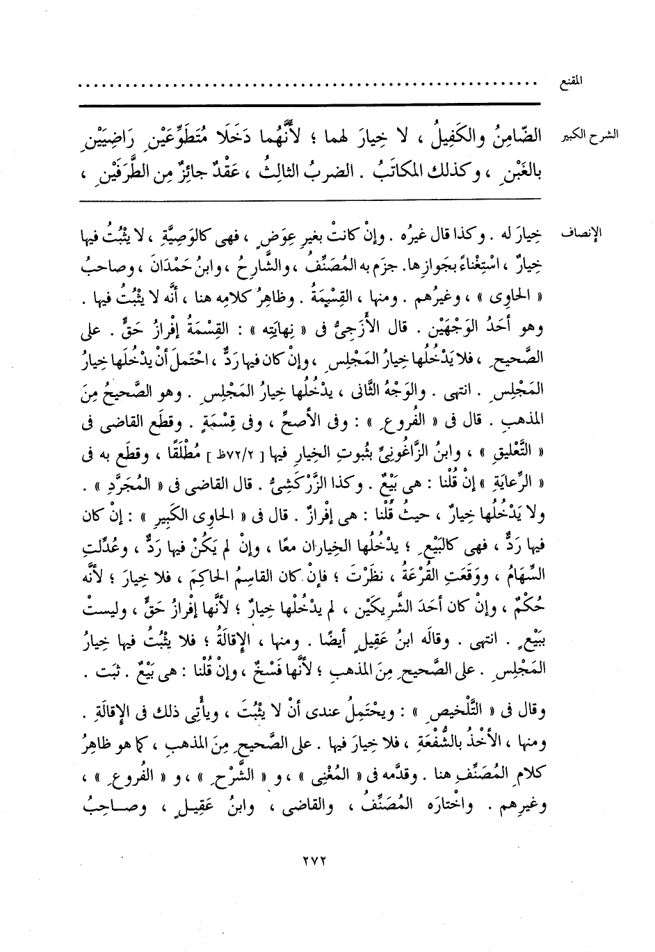 خِيارَ له. وكذا قال غيرُه. وإنْ كانتْ بغيرِ عِوَضٍ، فهى كالوَصِيَّةِ، لا يثْبُتُ فيها خِيارٌ، اسْتِغْناءً بجَوازِها. جزَم به المُصَنِّفُ، والشَّارِحُ، وابنُ حَمْدَانَ، وصاحبُ «الحاوِى»، وغيرُهم. ومنها، القِسْمَةُ. وظاهِرُ كلامِه هنا، أنَّه لا يثْبُتُ فيها. وهو أحَدُ الوَجْهَيْن. قال الأَزَجِىُّ فى «نِهايَتِه»: القِسْمَةُ إفْرازُ حَقٍّ. على الصَّحيحِ، فلا يَدْخُلُها خِيارُ المَجْلِسِ، وإنْ كان فيها رَدٌّ، احْتَملَ أَنْ يدْخُلَها خِيارُ المَجْلِسِ. انتهى. والوَجْهُ الثَّانى، يدْخُلُها خِيارُ المَجْلِسِ. وهو الصَّحيحُ مِنَ المذهبِ. قال فى «الفُروعِ»: وفى الأصحِّ، وفى قِسْمَةٍ. وقطَع القاضى فى «التَّعْليقِ»، وابنُ الزَّاغُونِىِّ بثُبوتِ الخِيارِ فيها مُطْلَقًا، وقطَع به فى «الرِّعايَةِ» إنْ قُلْنا: هى بَيْعٌ. وكذا الزَّرْكَشِىُّ. قال القاضى فى «المُجَرَّدِ». ولا يَدْخُلُها خِيارٌ، حيثُ قُلْنا: هى إفْرازٌ. قال فى «الحاوِى الكَبِيرِ»: إنْ كان فيها رَدٌّ، فهى كالبَيْعِ؛ يدْخُلُها الخِياران معًا، وإنْ لم يَكُنْ فيها رَدٌّ، وعُدِّلتِ السِّهَامُ، ووَقَعَتِ القُرْعَةُ، نظَرْتَ؛ فإنْ. كان القاسِمُ الحاكِمَ، فلا خِيارَ؛ لأنَّه حُكْمٌ، وإنْ كان أحَدَ الشَّريكَيْن؛ لم يدْخُلْها خِيارٌ؛ لأنَّها إفْرازُ حَقٍّ، وليستْ ببَيْعٍ. انتهى. وقالَه ابنُ عَقيلٍ أيضًا. ومنها، الإِقالَةُ؛ فلا يثْبُتُ فيها خِيارُ المَجْلِسِ. على الصَّحيحِ مِنَ المذهبِ؛ لأنَّها فَسْخٌ، وإنْ قُلْنا: هى بَيْعٌ. ثبَت. وقال فى «التَّلْخيصِ»: ويحْتَمِلُ عندى أَنْ لا يثْبُتَ، ويأْتِى ذلك فى الإِقالَةِ. ومنها، الأخْذُ بالشُّفْعَةِ، فلا خِيارَ فيها. على الصَّحيحِ مِنَ المذهبِ، كما هو ظاهِرُ كلامِ المُصَنِّفِ هنا. وقدَّمه فى «المُغْنِى»، و «الشَّرْحِ»، و «الفُروعِ»، وغيرِهم. واخْتارَه المُصَنِّفُ، والقاضى، وابنُ عَقِيلٍ، وصاحِبُ