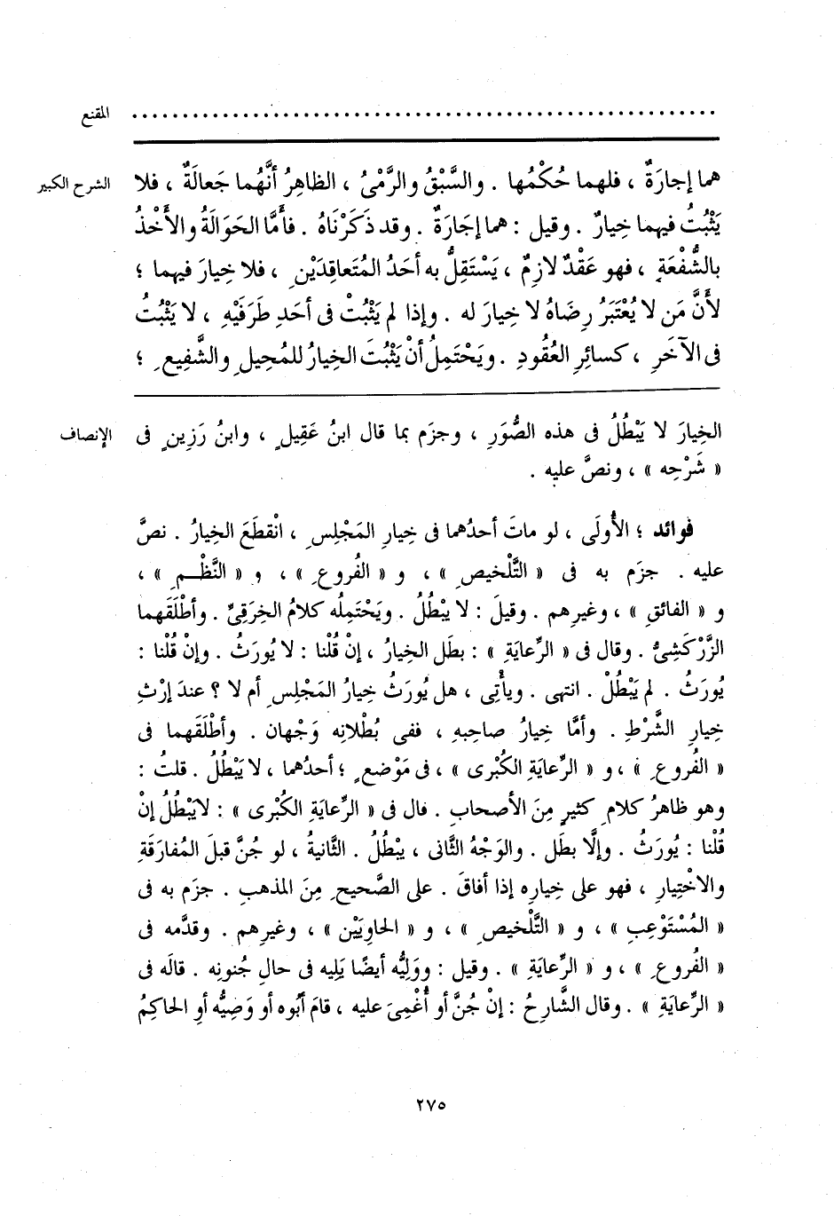 فوائد؛ الأُولَى، لو ماتَ أحدُهما فى خِيارِ المَجْلِسِ، انْقطَعَ الخِيارُ. نصَّ عليه. جزَم به فى «التَّلْخيصِ»، و «الفُروعِ»، و «النَّظْمِ»، و «الفائقِ»، وغيرِهم. وقيلَ: لا يبْطُلُ. ويَحْتَمِلُه كلامُ الخِرَقِىِّ. وأطْلَقَهما الزَّرْكَشِىُّ. وقال فى «الرِّعايَةِ»: بطَل الخِيارُ، إنْ قُلْنا: لا يُورَثُ. وإنْ قُلْنا: يُورَثُ. لم يَبْطُلْ. انتهى. ويأْتِى، هل يُورَثُ خِيارُ المَجْلِسِ أم لا؟ عندَ إرْثِ خِيارِ الشَّرْطِ. وأمَّا خِيارُ صاحِبهِ، ففى بُطْلانِه وَجْهان. وأطْلَقَهما فى «الفُروعِ»، و «الرِّعايَةِ الكُبْرى»، فى مَوْضع؛ أحدُهما، لا يَبْطُلُ. قلتُ: وهو ظاهرُ كلامِ كثيرٍ مِنَ الأصحابِ. قال فى «الرِّعايَةِ الكُبْرى»: لا يَبْطُلُ إنْ قُلْنا: يُورَثُ. وإلَّا بطَل. والوَجْهُ الثَّانى، يبْطُلُ. الثَّانيةُ، لو جُنَّ قبلَ المُفارَقَةِ والاخْتِيارِ، فهو على خِيارِه إذا أفاقَ. على الصَّحيحِ مِنَ المذهبِ. جزَم به فى «المُسْتَوْعِبِ»، و «التَّلْخيصِ»، و «الحاوِيَيْن»، وغيرِهم. وقدَّمه فى «الفُروعِ»، و «الرِّعايَةِ». وقيل: ووَلِيُّه أيضًا يَلِيه فى حالِ جُنونِه. قالَه فى «الرِّعايَةِ». وقال الشَارِحُ: إنْ جُنَّ أو أُغْمِىَ عليه، قامَ أَبُّوه أو وَصِيُّه أوِ الحاكِمُ