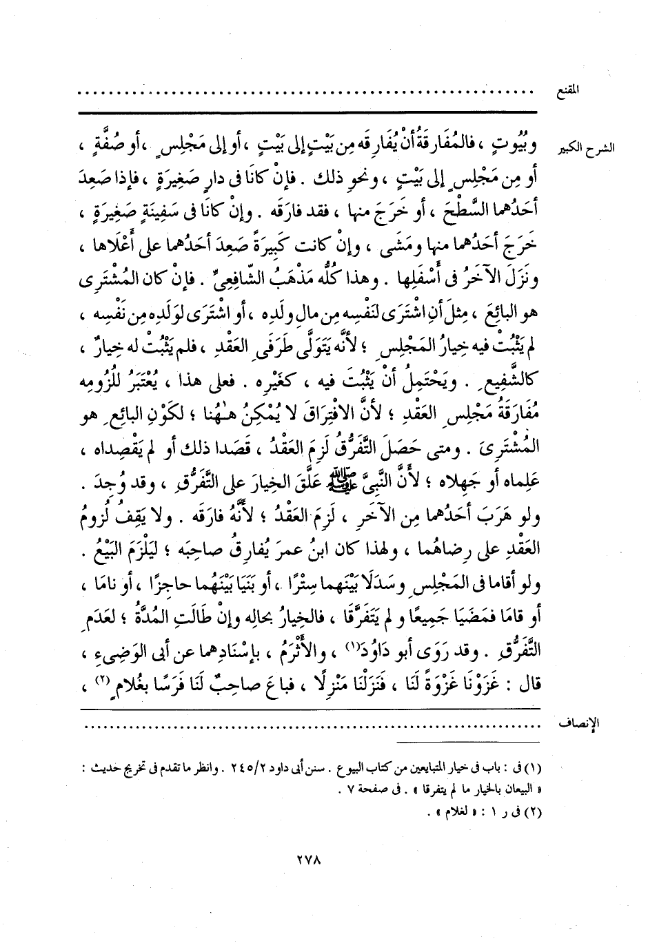 وبُيُوتٍ، فالمُفَارقَةُ أَنْ يُفَارِقَه مِن بَيْتٍ إلى بَيْتٍ، أو إلى مَجْلِسٍ، أو صُفَّةٍ، أو مِن مَجْلِسٍ إلى بَيْتٍ، ونحوِ ذلك. فإنْ كانَا في دارٍ صَغِيرَةٍ، فإذا صَعِدَ أحَدُهما السَّطْحَ، أو خَرَجَ منها، فقد فارَقَه. وإنْ كانَا في سَفِينَةٍ صَغِيرَةٍ، خَرَجَ أحَدُهما منها ومَشَى، وإنْ كانت كَبِيرَةً صَعِدَ أحَدُهما على أَعْلَاها، ونَزَلَ الآخَرُ في أَسْفَلِها. وهذا كُلُّه مَذْهَبُ الشّافِعِىِّ. فإنْ كان المُشْتَرِى هو البائِعَ، مِثلَ أنِ اشْتَرَى لنَفْسِه مِن مالِ ولَدِه، أو اشْتَرَى لوَلَدِه مِن نَفْسِه، لم يَثْبُتْ فيه خِيارُ المَجْلِسِ؛ لأنَّه يَتَوَلَّى طَرَفَىِ العَقْدِ، فلم يَثْبُتْ له خِيارٌ، كالشَّفِيعِ. ويَحْتَمِلُ أَنْ يَثْبُتَ فيه، كغَيْرِه. فعلى هذا، يُعْتَبَرُ للُزُومِه مُفَارَقَةُ مَجْلِسِ العَقْدِ؛ لأَنَّ الافْتِرَاقَ لا يُمْكِنُ ههنا؛ لكَوْنِ البائِعِ هو المُشْتَرِىَ. ومتى حَصَلَ التَّفَرُّق لَزِمَ العَقْدُ، قَصَدا ذلك أو لم يَقْصِداه، عَلِماه أو جَهِلاه؛ لأَنَّ النَّبِىِّ -صلى اللَّه عليه وسلم- عَلَّقَ الخِيارَ عِلى التَّفَرُّقِ، وقد وُجِدَ. ولو هَرَبَ أحَدُهما مِن الآخرِ، لَزِمَ العَقْدُ؛ لأنَّهُ فارَقَه. ولا يَقِفُ لُزومُ العَقْدِ على رِضاهُما، ولهذا كان ابنُ عمرَ يُفارِقُ صاحِبَ؛ ليَلْزَمَ البَيْعُ. ولو أقاما في المَجْلِسِ وسَدَلَا بَيْنَهما سِتْرًا، أو بَنَيَا بَيْنَهُما حاجِزًا، أو نامَا، أو قامَا فمَضَيَا جَمِيعًا ولم يَتَفَرَّقَا، فالخِيارُ بحالِه وإنْ طَالَتِ المُدَّةُ؛ لعَدَمِ التَّفَرُّقِ. وقد رَوَى أبو دَاوُدَ (¬1)، والأَثْرَمُ، بإسْنَادِهما عنِ أبى الوَضِئِ، قال: غَزَوْنَا غَزْوَةً لَنَا، فَنَزَلْنَا مَنْزِلًا، فباعَ صاحِبٌ لَنَا فرَسًا بغُلامٍ (¬2)،