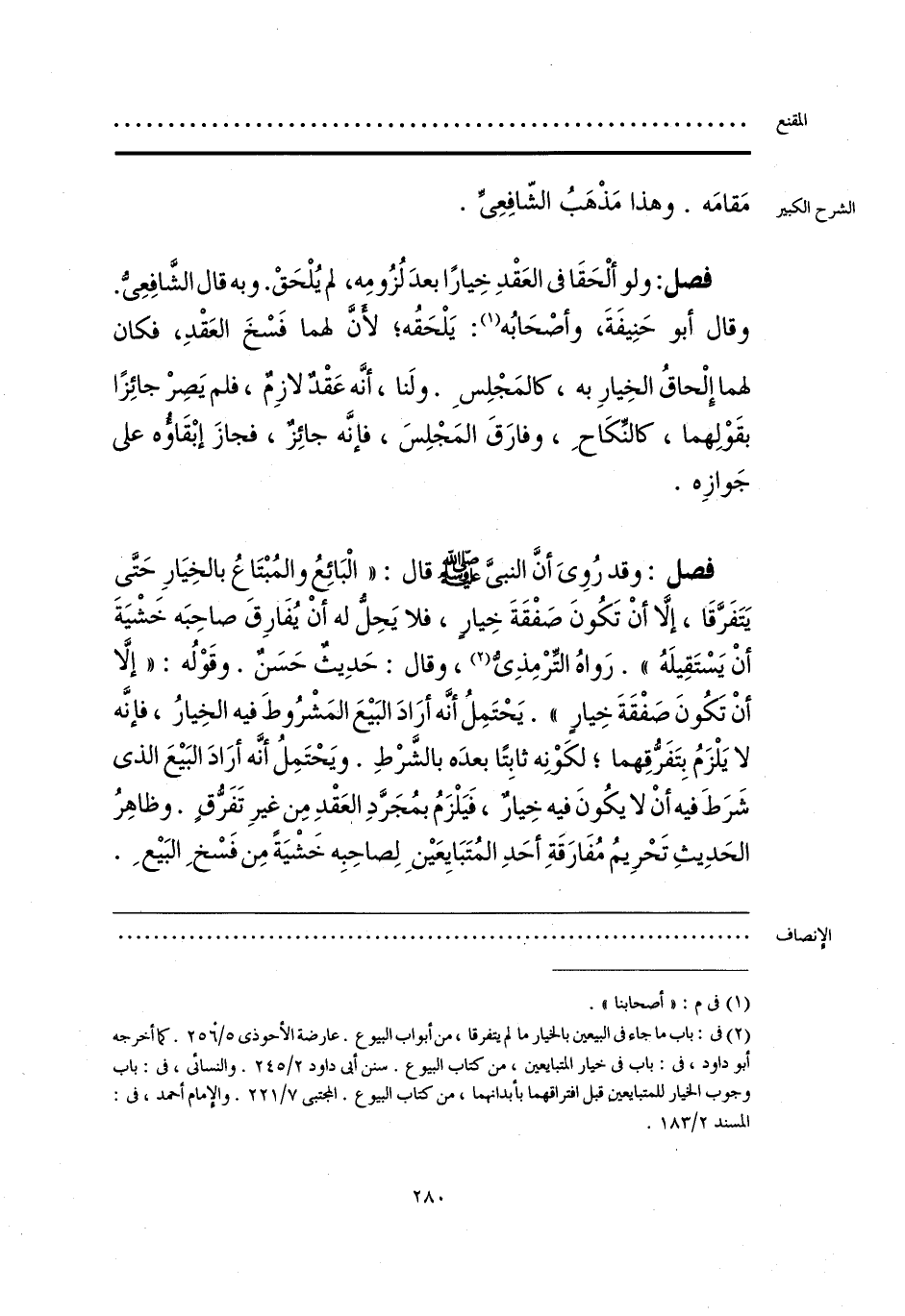 فصل: وقد رُوِى أنَّ النبىَّ -صلى اللَّه عليه وسلم- قال: «الْبَائِعُ والمُبْتَاعُ بالخِيَارِ حَتَّى يَتَفَرَّقَا، إلَّا أَنْ تَكُونَ صَفْقَةَ خِيارٍ، فلا يَحِلُّ له أَنْ يُفَارِق صاحِبَه خَشْيَةَ أَنْ يَسْتَقِيلَهُ». رَواهُ التِّرْمِذِىُّ (¬2)، وقال: حَدِيثٌ حَسَنٌ. وقَوْلُه: «إلَّا أَنْ تَكُونَ صَفْقَةَ خِيارٍ». يَحْتَمِلُ أنَّه أرَادَ البَيْعَ المَشْرُوطَ فيه الخِيارُ، فإنَّه لا يَلْزَمُ بِتَفَرُّقِهما؛ لكَوْنِه ثابِتًا بعدَه بالشَّرْطِ. ويَحْتَمِلُ أنَّه أرَادَ البَيْعَ الذى شَرَطَ فيه أَنْ لا يكُونَ فيه خِيارٌ، فَيَلْزَمُ بمُجَرَّدِ العَقْدِ ين غيرِ تَفَرُّقٍ. وظاهِرُ الحَدِيثِ تَحْرِيمُ مُفَارَقَةِ أحَدِ المُتَبَايِعَيْنِ لِصاحِبِه خَشْيَةً مِن فَسْخِ البَيْعِ.