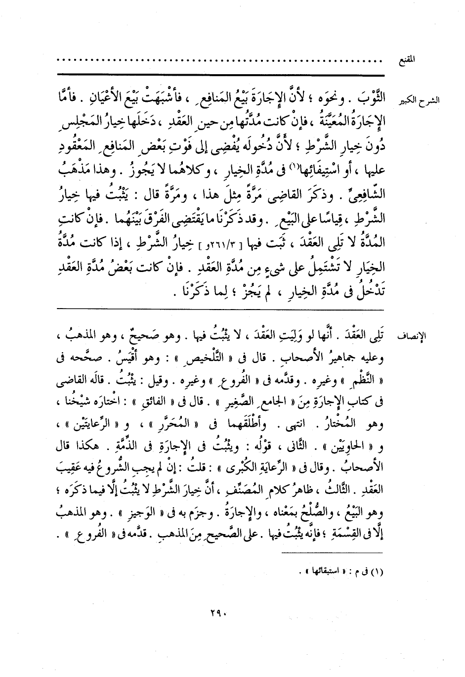 تَلِى العَقْدَ. أنَّها لو وَلِيَتِ العَقْدَ، لا يثْبُتُ فيها. وهو صَحيحٌ، وهو المذهبُ، وعليه جماهيرُ الأصحابِ. قال فى «التَّلْخيصِ»: وهو أقْيَسُ. صحَّحه فى «النَّظْمِ» وغيرِه. وقدَّمه فى «الفُروعِ» وغيرِه. وقيل: يثْبُت. قالَه القاضى فى كتابِ الإِجارَةِ مِنَ «الجامعِ الصَّغِيرِ». قال فى «الفائقِ»: اخْتارَه شيْخُنا، وهو المُخْتارُ. انتهى. وأطْلَقَهما فى «المُحَرَّرِ»، و «الرِّعايتَيْن»، و «الحاوِيَيْن». الثَّانى، قوْلُه: ويثْبُتُ فى الإِجارَةِ فى الذِّمَّةِ. هكذا قال الأصحابُ. وقال فى «الرِّعايَةِ الكُبْرى»: قلتُ: إنْ لم يجِبِ الشُّروعُ فيه عَقِيبَ العَقْدِ. الثَّالثُ، ظاهرُ كلامِ المُصَنِّفِ، أنَّ خِيارَ الشَّرْطِ لا يثْبُتُ إلَّا فيما ذكَرَه؛ وهو البَيْعُ، والصُّلْحُ بمَعْناه، والإِجارَةُ. وجزَم به فى «الوَجيزِ». وهو المذهبُ إلَّا فى القِسْمَةِ؛ فإنَّه يثْبُتُ فيها. على الصَّحيحِ مِنَ المذهبِ. قدَّمه فى «الفُروعِ».