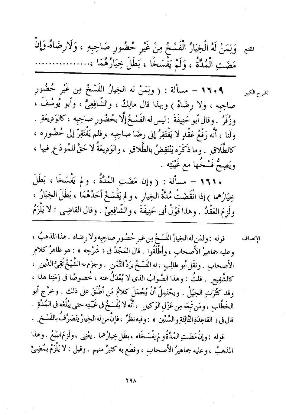 قوله: ولمَن له الخِيارُ الفَسْخُ مِن غيرِ حُضُورِ صاحِبِه ولا رِضاه. هذا المذهبُ، وعليه جماهيرُ الأصحابِ، وأطْلَقُوا. قال المَجْدُ في «شَرْحِه»: هو ظاهرُ كلامِ الأصحابِ. ونقَل أبو طالِبٍ، له الفَسْخُ برَدِّ الثَّمَنِ. وجزَم به الشَّيخُ تَقِيُّ الدِّينِ، كالشَّفِيعِ. قلتُ: وهذا الصَّوابُ الذي لا يُعْدَلُ عنه، خُصوصًا في زَمَنِنا هذا، وقد كَثُرَتِ الحِيَلُ. ويحْتَمِلُ أنْ يُحْمَلَ كلامُ مَن أطْلَقَ على ذلك. وخرَّج أبو الخَطَّابِ، ومَن تَبِعَه مِن عَزْلِ الوَكيلِ، أنَّه لا يُفْسَخُ في غَيبَتِه حتى يبْلُغَه في المُدَّةِ. قال في «القاعِدَةِ الثَّالِثَةِ والسِّتين»: وفيه نظَرٌ، فإنَّ من له الخِيارُ يتَصَرَّفُ بالفَسْخِ.