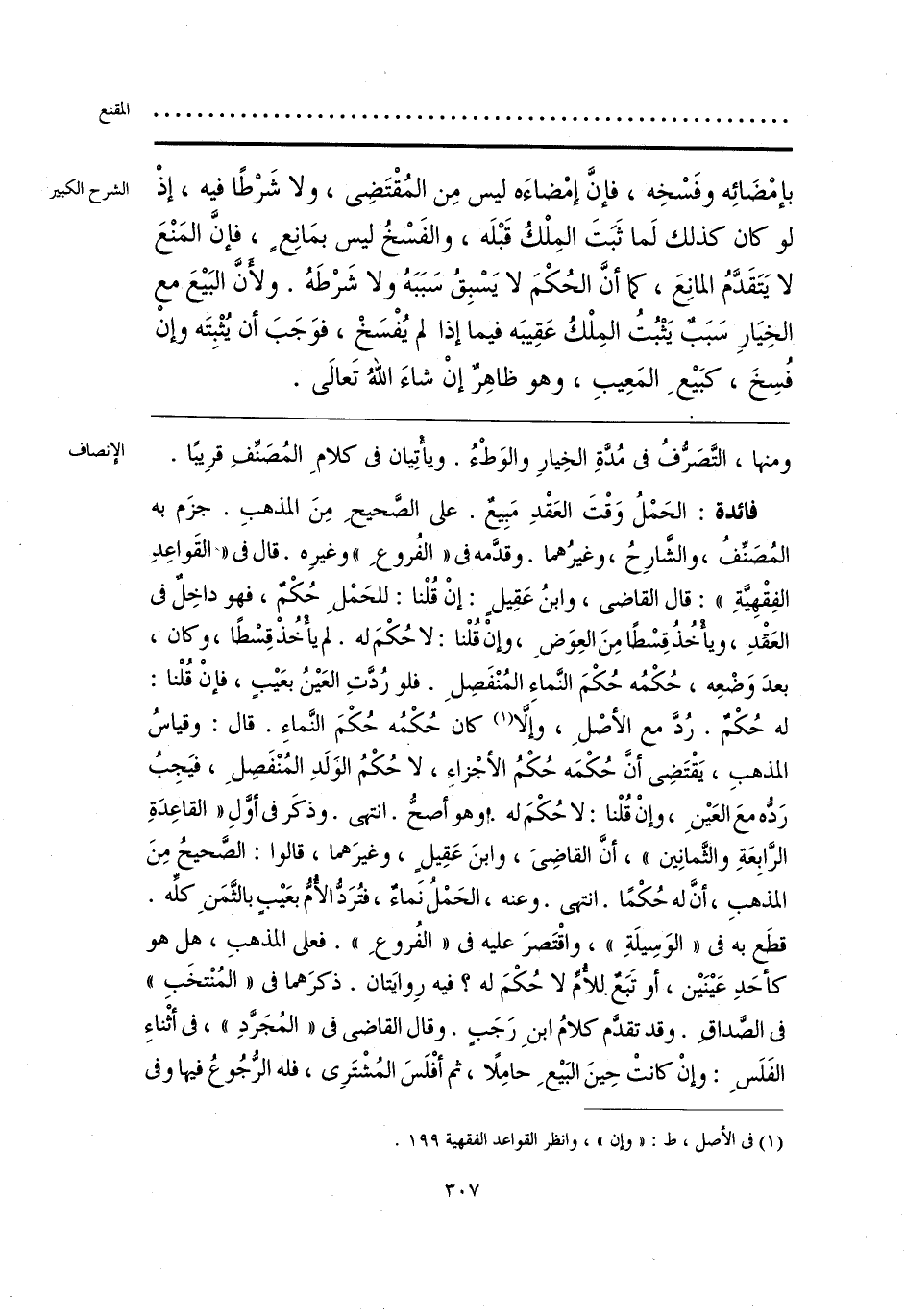 فائدة: الحَمْلُ وَقْتَ العَقْدِ مَبِيعٌ. على الصَّحيحِ مِنَ المذهبِ. جزَم به المُصَنِّفُ، والشَّارِحُ، وغيرُهما. وقدَّمه في «الفُروعِ» وغيرِه. قال في «القَواعِدِ الفِقْهِيَّةِ»: قال القاضي، وابنُ عَقِيلٍ: إنْ قُلْنا: للحَمْلِ حُكْمٌ، فهو داخِلٌ في العَقدِ، ويأْخُذُ قِسْطًا مِنَ العِوَضِ، وإنْ قُلْنا: لا حُكْمَ له. لم يأْخُذْ قِسْطًا، وكان، بعدَ وَضْعِه، حُكْمُه حُكْمَ النَّماءِ المُنْفَصِلِ. فلو رُدَّتِ العَينُ بعَيبٍ، فإنْ قُلْنا: له حُكْمٌ. رُدَّ مع الأصْلِ، وإلَّا (¬1) كان حُكْمُه حُكْمَ النَّماءِ. قال: وقياسُ المذهبِ، يَقْتَضِي أنَّ حُكْمَه حُكْمُ الأجْزاء، لا حُكْمُ الوَلَدِ المُنْفَصِلِ، فيَجِبُ رَدُّه معَ العَينِ، وإنْ قُلْنا: لا حُكْمَ له. وهو أصحُّ. انتهى. وذكَر في أوَّلِ «القاعِدَةِ الرَّابِعَةِ والثَّمانِين»، أنَّ القاضِيَ، وابنَ عَقِيل، وغيرَهما، قالوا: الصَّحيحُ مِنَ المذهبِ، أنَّ له حُكْمًا. انتهى. وعنه، الحَمْلُ نَماءٌ، فتُرَدُّ الأُمُّ بعَيبٍ بالثَّمَنِ كلِّه. قطَع به في «الوَسِيلَةِ»، واقْتَصرَ عليه في «الفُروعِ». فعلى المذهبِ، هل هو كأحَدِ عَينَين، أو تَبَعٌ للأُمِّ لا حُكْمَ له؟ فيه رِوايَتان. ذكرَهما في «المُنْتخَبِ» في الصَّداقِ. وقد تقدَّم كلامُ ابنِ رَجَبٍ. وقال القاضي في «المُجَرَّدِ»، في أثْناءِ الفَلَسِ: وإنْ كانتْ حِينَ البَيعِ حامِلًا، ثم أفْلَسَ المُشْتَرِي، فله الرُّجُوعُ فيها وفي