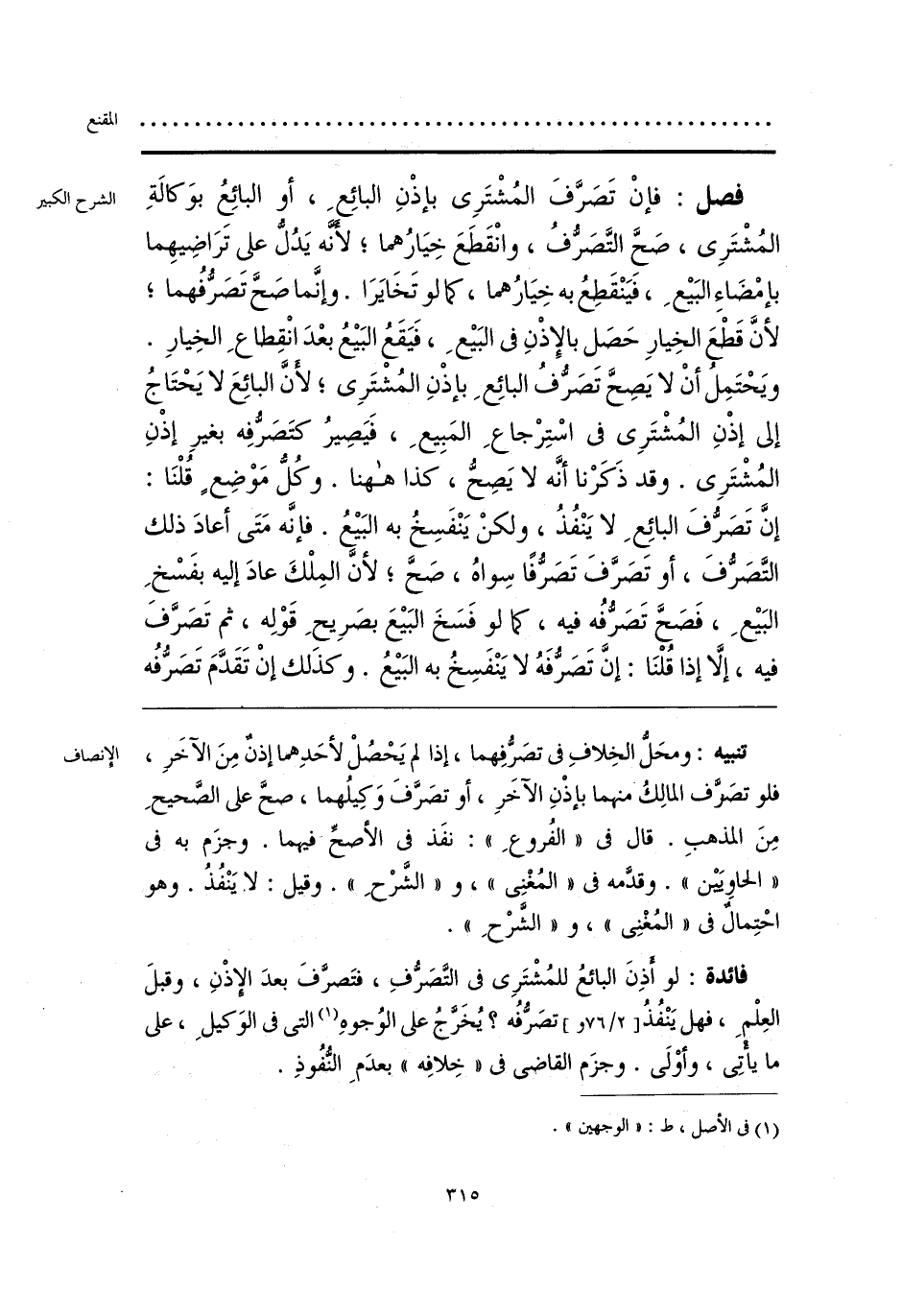 تنبيه: ومحَلُّ الخِلافِ في تصَرُّفِهما، إذا لم يَحْصُلْ لأحَدِهما إذنٌ مِنَ الآخَرِ، فلو تصَرَّف المالِكُ فهما بإذْنِ الآخَرِ، أو تصَرَّفَ وَكِيلُهما، صحَّ على الصَّحيحِ مِنَ المذهبِ. قال في «الفُروعِ»: نفَذ في الأصحِّ فيهما. وجزَم به في «الحاويَيْن». وقدَّمه في «المُغْنِي»، و «الشّرْحِ». وقيل: لا يَنْفُذ. وهو احْتِمالٌ في «المُغْنِي»، و «الشَّرْحِ».