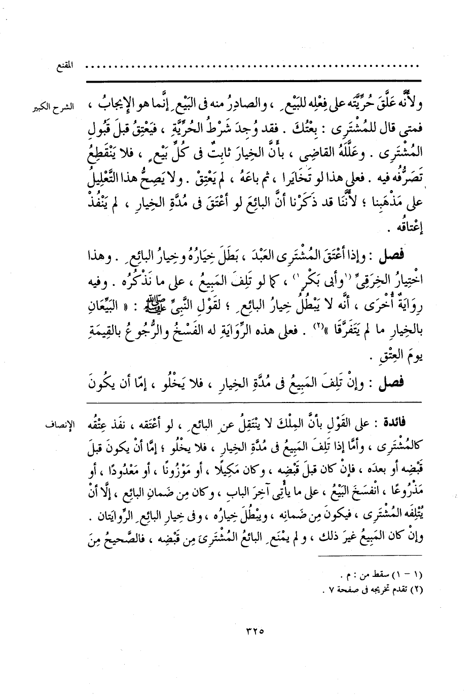 فائدة: على القَوْلِ بأنَّ المِلْكَ لا ينْتَقِلُ عنِ البائعِ، لو أعْتَقه، نفَذ عِتْقُه كالمُشْتَرِي، وأمَّا إذا تَلِفَ المَبِيعُ في مُدَّةِ الخِيارِ، فلا يخْلُو؛ إمَّا أنْ يكونَ قبلَ قَبْضِه أو بعدَه، فإنْ كان قبلَ قَبْضِه، وكان مَكِيلًا، أو مَوْزُونًا، أو مَعْدُودًا، أو مَذْرُوعًا، انْفسَخَ البَيعُ، على ما يأْتِي آخِرَ البابِ، وكان مِن ضَمانِ البائِع، إلَّا أنْ يُتْلِفَه المُشْتَرِي، فيكونَ مِن ضَمانِه، ويبْطُلَ خِيارُه، وفي خِيارِ البائِعِ الرِّوايَتان. وإنْ كان المَبِيعُ غيرَ ذلك، ولم يمْنَعِ البائعُ المُشْتَرِيَ مِن قَبْضِه، فالصَّحيحُ مِنَ