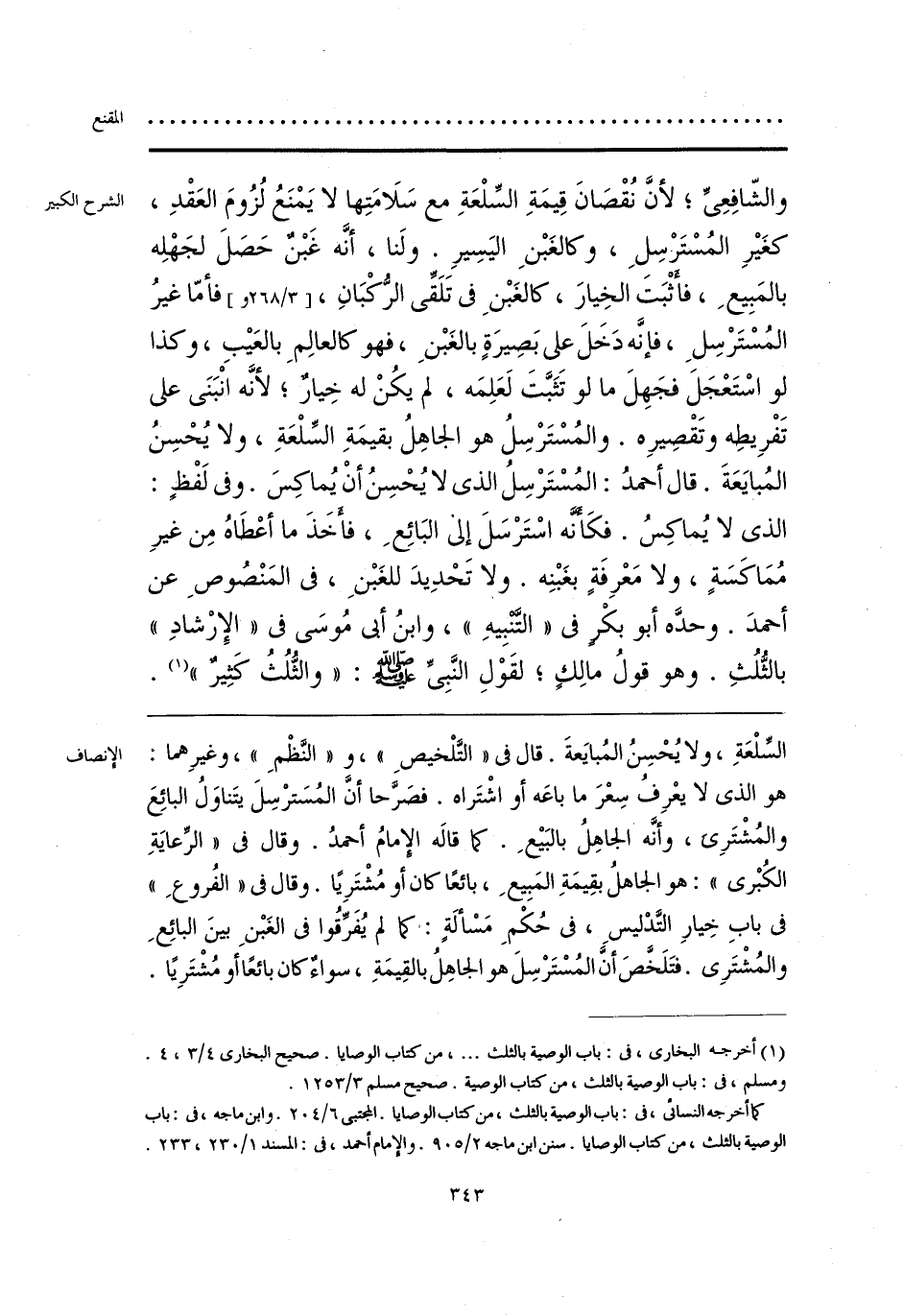 السِّلْعَةِ، ولا يُحْسِنُ المُبايَعةَ. قال في «التَّلْخيصِ»، و «النَّظْمِ»، وغيرِهما: هو الذي لا يعْرِفُ سِعْرَ ما باعَه أو اشْتَراه. فصَرَّحا أنَّ المُسَترْسِلَ يتَناوَلُ البائِعَ والمُشْتَرِى، وأنَّه الجاهِلُ بالبَيعِ. كما قاله الامامُ أحمدُ. وقال في «الرِّعايَةِ الكُبْرى»: هو الجاهلُ بقِيمَةِ المَبِيعِ، بائعًا كان أو مُشْتَرِيًا. وقال في «الفُروعِ» في بابِ خِيارِ التَّدْليسِ، في حُكْمِ مَسْألَةٍ: كما لم يُفَرِّقُوا في الغَبْنِ بينَ البائِع والمُشْتَرِي. فتَلَخَّصَ أنَّ المُسْتَرْسِلَ هو الجاهِلُ بالقِيمَةِ، سواءٌ كان بائعًا أو مُشتَرِيًا.