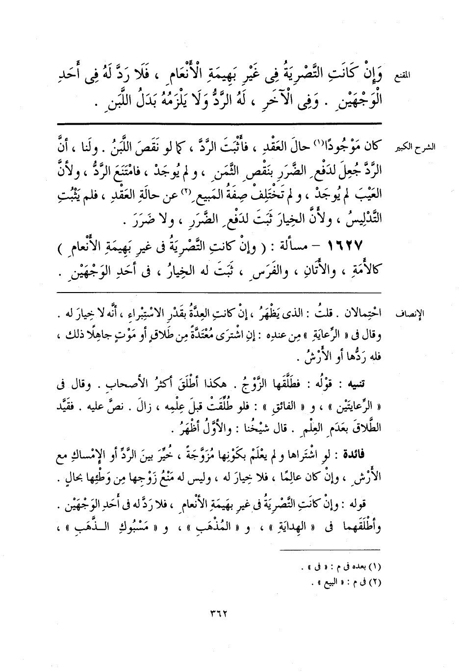 قوله: وإنْ كانَتِ التَّصْرِيَةُ في غيرِ بهَيمَةِ الأنْعامِ، فلا رَدَّ له في أحَدِ الوَجْهَين. وأطْلَقَهما في «الهِدايَةِ»، و «المُذْهَبِ»، و «مَسْبُوكِ الذهَبِ»،