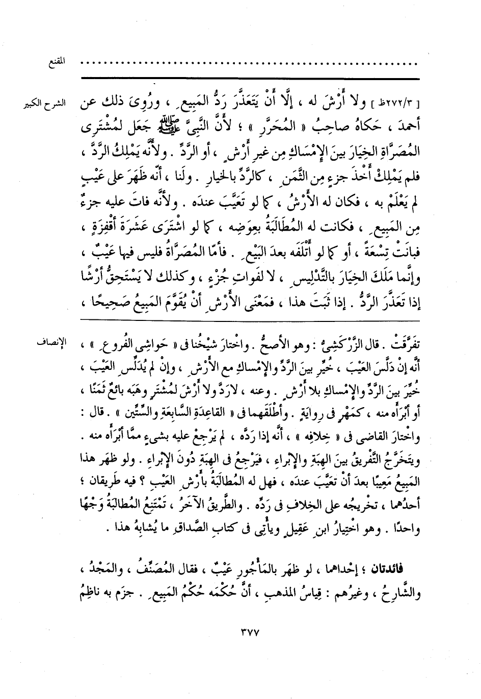 تفَرَّقَتْ. قال الزَّرْكَشِيُّ: وهو الأصحُّ. واخْتارَ شيخُنا في «حَواشِي الفُروعِ»، أنَّه إنْ دَلَّسَ العَيبَ، خُيِّرِ بينَ الرَّدِّ والإمْساكِ مع الأرْشِ، وإنْ لم يُدَلسِ العَيبَ، خُيِّرَ بينَ الرَّدِّ والإمْساكِ بلا أَرْشٍ. وعنه، لا رَدَّ ولا أَرشَ لمُشْتَرٍ وهَبَه بائعٌ ثَمَنًا، أو أْبرَأَه منه، كمَهْرٍ في رِوايَةٍ. وأطْلَقَهما في «القاعِدَةِ السَّابِعَةِ والسِّتِّين». قال: واخْتارَ القاضي في «خِلافِه»، أنَّه إذا رَدَّه، لم يَرْجِعْ عليه بشيءٍ ممَّا أبْرَأه منه. ويتَخَرَّجُ التَّفْريقُ بينَ الهِبَةِ والإبراءِ، فيَرْجِعُ في الهِبَةِ دُونَ الإبراءِ. ولو ظهَر هذا المَبِيعُ مَعِيبًا بعدَ أنْ تعَيَّبَ عندَه، فهل له المُطالبَةُ بأرْيقِ العَيبِ؟ فيه طَريقان؛ أحدُهما، تخْريجُه على الخِلافِ في رَدِّه. والطَّريقُ الآخَرُ، تَمْتَنِعُ المُطالبةُ وَجْهًا واحدًا. وهو اخْتِيارُ ابنِ عَقِيلٍ ويأْتِي في كتابِ الصَّداقِ ما يُشابِهُ هذا.