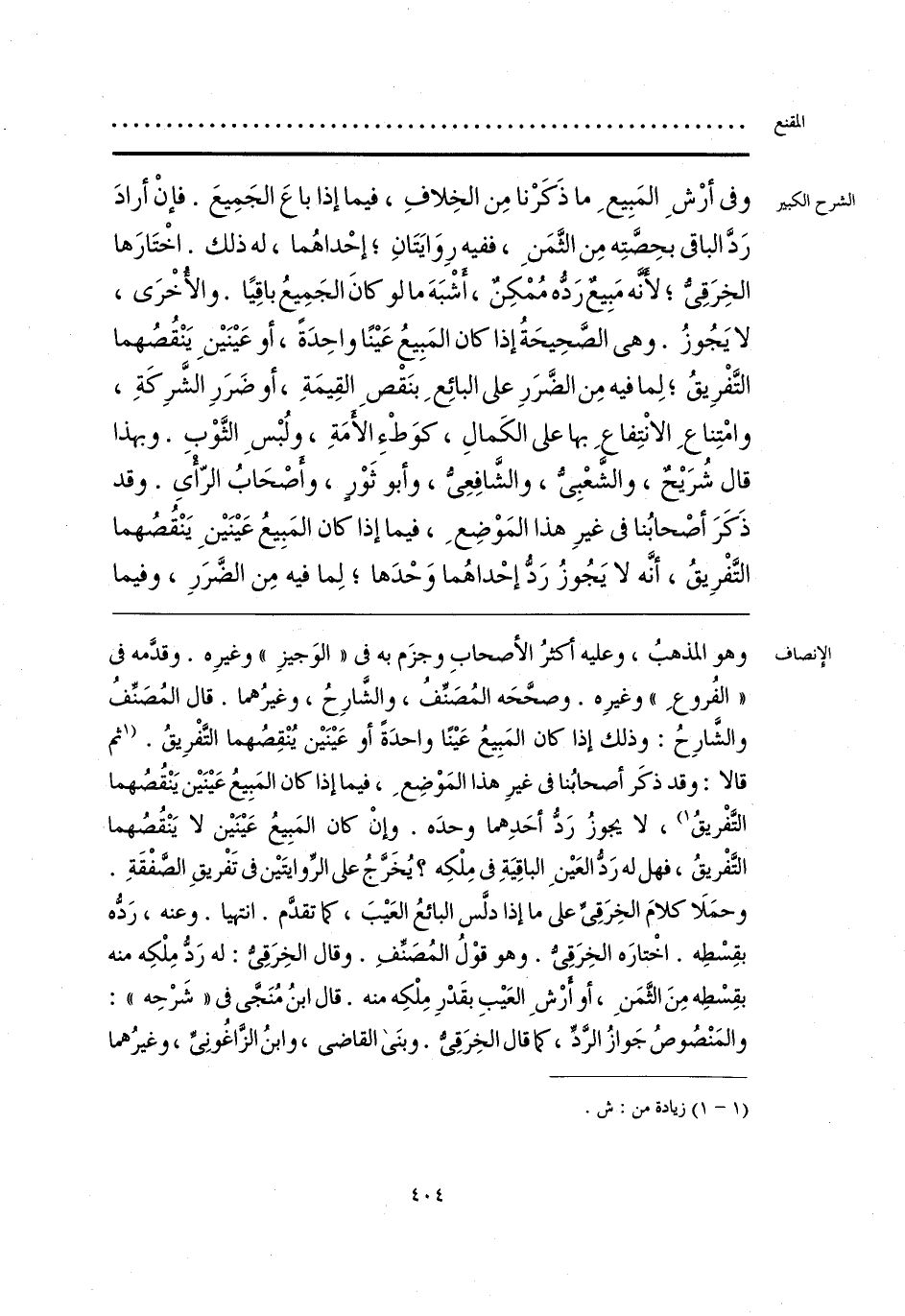 وهو المذهبُ، وعليه أكثرُ الأصحابِ وجزَم به في «الوَجيزِ» وغيرِه. وقدَّمه في «الفُروعِ» وغيرِه. وصحَّحَه المُصَنِّفُ، والشَّارِحُ، وغيرُهما. قال المُصَنِّفُ والشَّارِحُ: وذلك إذا كان المَبِيعُ عَينًا واحدَةً أو عَينَين يُنْقِصُهما التَّفْرِيقُ. [ثم قالا: وقد ذكَر أصحابُنا في غيرِ هذا المَوْضِعِ، فيما إذا كان المَبِيعُ عَينَين يَنْقُصُهما التَّفْريقُ] (¬1)، لا يجوزُ رَدُّ أحَدِهما وحدَه. وإنْ كان المَبِيعُ عَينَين لا يَنْقُصُهما التَّفْريقُ، فهل له رَدُّ العَينِ الباقِيَةِ في مِلْكِه؟ يُخرَّجُ على الرِّوايتَين في تَفْريقِ الصَّفْقَةِ. وحمَلَا كلامَ الخِرَقِيِّ على ما إذا دلَّس البائعُ العَيبَ، كما تقدَّم. انتهيا. وعنه، رَدُّه بقِسْطِه. اخْتارَه الخِرَقِيُّ. وهو قوْلُ المُصَنفِ. وقال الخِرَقِيُّ: له رَدُّ مِلْكِه منه بقِسْطِه مِنَ الثَّمَنِ، أو أرْشِ العَيبِ بقَدْرِ مِلْكِه منه. قال ابنُ مُنَجَّى في «شَرْحِه»: والمَنْصُوصُ جَوازُ الرَّدِّ، كما قال الخِرَقِيُّ. وبنَى القاضي، وابنُ الزاغُونِيِّ، وغيرُهما