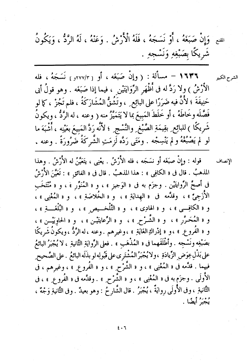 قوله: وإِنْ صبَغَه أو نسَجَه، فله الأرْشُ. يعْنِي، يتَعَيَّنُ له الأرْشُ. وهذا المذهبُ. قال في «الكافِي»: هذا المذهبُ. قال في «الفائقِ»: تَعَيَّنَ الأرْشُ في أصحِّ الرِّوايتَين. وجزَم به في «الوَجيزِ»، و «المُنَوِّرِ»، و «مُنْتَخَبِ الأزَجِيِّ»، وقدَّمه في «الهِدايَةِ»، و «الخُلاصَةِ»، و «المُغْنِي»، و «الكافِي»، و «الهادِي»، و «التَّلْخيصِ»، و «البُلْغَةِ»، و «المُحَرَّرِ»، و «الشَّرْحِ»، و «الرِّعايتَين»، و «الحاويَين»، و «الفُروعِ»، و «إدْراكِ الغَايَةِ»، وغيرِهم. وعنه، له الردُّ، ويكونُ شَرِيكًا بصَبْغِه ونَسْجِه. وأطْلَقَهما في «المُذْهَبِ». فعلى الرِّوايَةِ الثَّانيةِ، لا يُجْبَرُ البائعُ على بَذْلِ عِوَضِ الزِّيادَةِ، ولا يُجْبَرُ المُشْتَرِي على قَبُولِه لو بذَلَه البائعُ. على الصَّحيحِ فيهما. قدَّمه في «المُغْنِي»، و «الشَّرْحِ»، و «الفُروعِ»، وغيرِهم، في الأولَى. وجزَم به في «المُغْنِي»، و «الشَّرْحِ». وقدَّمه في «الفُروعِ»، في الثَّانيةِ، وفي الأُولَى رِوايَةٌ، يُجْبَرُ. قال الشَّارِحُ: وهو بعيدٌ. وفي الثَّانيةِ وَجْهٌ، يُجْبَرُ أيضًا.