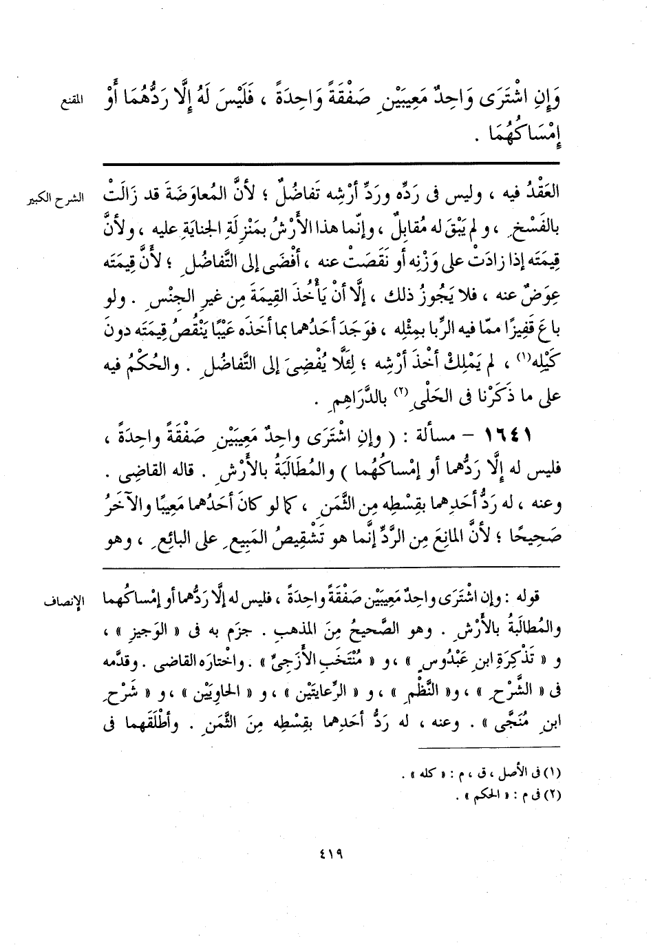 قوله: وإن اشْتَرَى واحِدٌ مَعِيبَين صَفْقَةً واحِدَةً، فليس له إلَّا رَدُّهما أو إمْساكُهما والمُطالبةُ بالأَرْشِ. وهو الصَّحيحُ مِنَ المذهبِ. جزَم به في «الوَجيزِ»، و «تَذْكِرَةِ ابنِ عَبْدُوسٍ»، و «مُنْتَخَبِ الأَزَجِيِّ». واخْتارَه القاضي. وقدَّمه في «الشَّرْحِ»، و «النَّظْمِ»، و «الرِّعايتَين»، و «الحاويَين»، و «شَرْحِ ابنِ مُنَجَّى». وعنه، له رَدُّ أحَدِهما بقِسْطِه مِنَ الثَّمَنِ. وأطْلَقَهما في