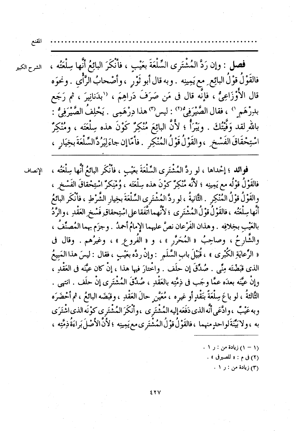 فوائد؛ إحْداها، لو ردَّ المُشْتَري السِّلْعَةَ بعَيبٍ، فأنْكَر البائعُ أنَّها سِلْعَتُه، فالقَوْلُ قوْلُه مع يَمِينِه؛ لأنَّه مُنْكِرٌ كوْنَ هذه سِلْعَتَه، ومُنْكرٌ اسْتِحْقاقَ الفَسْخِ، والقَوْلُ قوْلُ المُنْكِرِ. الثَّانيةُ، لو ردَّ المُشْتَرِي السِّلْعَةَ بخِيارِ الشَّرْطِ، فأنْكَر البائعُ أنَّها سِلْعَتُه، فالقَوْلُ قوْلُ المُشْتَرِي؛ لأنَّهما اتَّفَقا على اسْتِحقاقِ فَسْخِ العَقْدِ، والرَّدُ بالعَيبِ بخِلافِه. وهذان الفَرْعان نصَّ عليهما الإِمامُ أحمدُ. وجزَم بهما المُصنِّفُ، والشَّارِحُ، وصاحِبُ «المُحَرَّرِ»، و «الفُروعِ»، وغيرُهم. وقال في «الرِّعايَةِ الكُبْرى»، قُبَيلَ بابِ السَّلَمِ: وإنْ ردَّه بعَيبٍ، فقال: ليسَ هذا المَبِيعُ الذي قبَضْتَه مِنِّي. صُدِّقَ إن حلَف. واخْتارَ فيها هذا، إنْ كان عيَّنَه في العَقْدِ، وإنْ عيَّنَه بعدَه عمَّا وجَب في ذِمَّتِه بالعَقْدِ، صُدِّقَ المُشْتَرِي إنْ حلَف. انتهى. الثَّالثةُ، لو باعَ سِلْعَةً بنَقْدٍ أو غيرِه، مُعَيَّنٍ حال العَقْدِ، وقبَضَه البائعُ، ثم أحْضَرَه وبه عَيبٌ، وادَّعَى أنَّه الذي دَفَعَه إليه المُشْتَرِي، وأنْكَرَ المُشْتَرِي كوْنَه الذي اشْتَرَى به، ولا بَيِّنَةَ لواحدٍ منهما، فالقَوْلُ قوْلُ المُشْتَرِي مع يَمِينِه؛ لأنَّ الأصْلَ بَراءَةُ ذِمَّتِه،