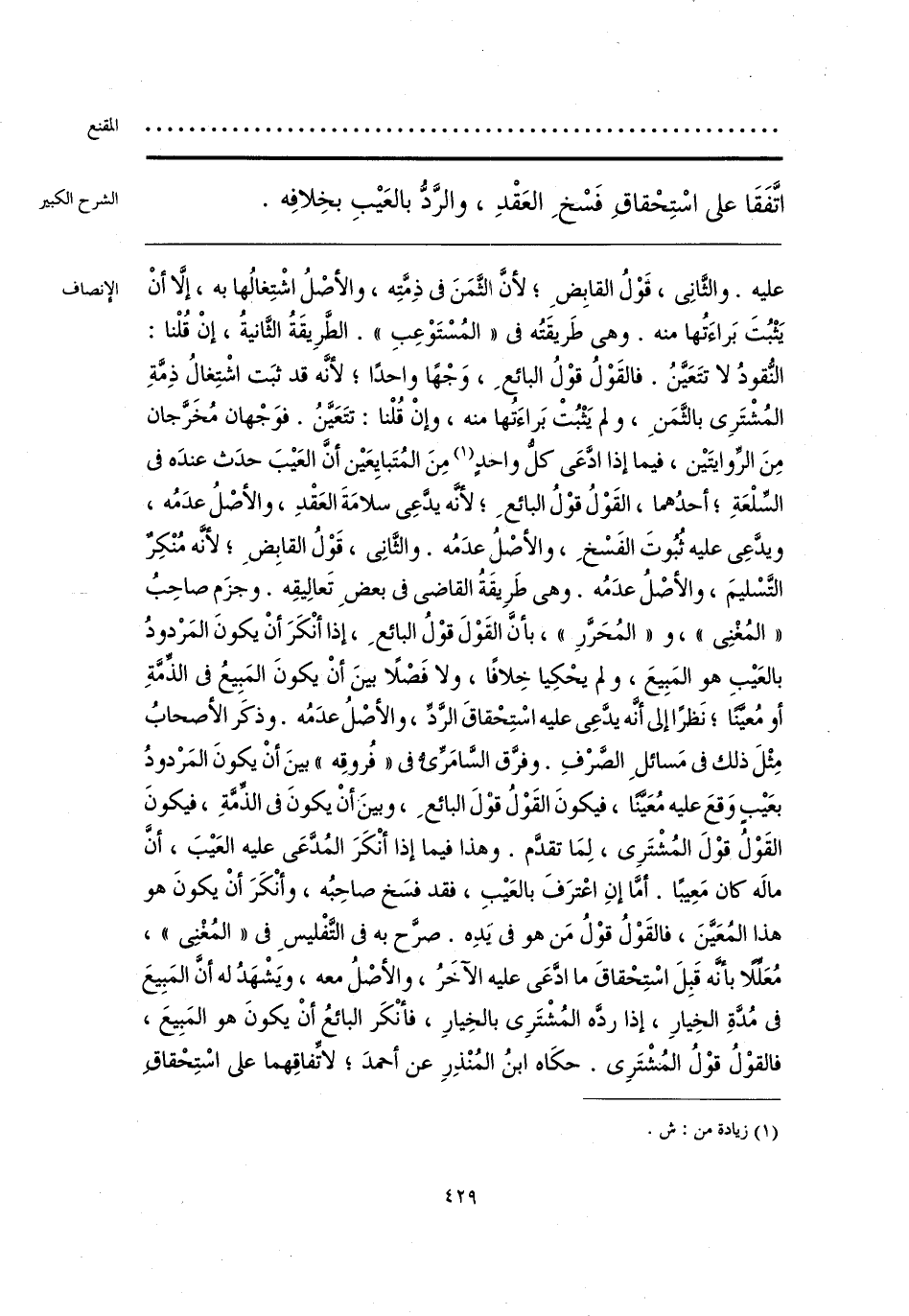 عليه. والثَّانِي، قَوْلُ القابِضِ؛ لأنَّ الثَّمَنَ في ذِمَّتِه، والأصْلُ اشْتِغالها به، إلَّا أنْ يَثْبُتَ بَراءَتُها منه. وهي طَريقَتُه في «المُسْتَوْعِبِ». الطَّرِيقَةُ الثَّانيةُ، إنْ قُلْنا: النُّقودُ لا تتَعَيَّنُ. فالقَوْلُ قوْلُ البائعِ، وَجْهًا واحدًا؛ لأنَّه قد ثبَت اشْتِغالُ ذِمَّةِ المُشْتَرِي بالثَّمَنِ، ولم يَثْبُتْ بَراءَتُها منه، وإنْ قُلْنا: تتَعَيَّنُ. فوَجْهان مُخَرجان مِنَ الرِّوايتَين، فيما إذا ادَّعَى كلُّ واحدٍ (¬1) مِنَ المُتَبايِعَين أنَّ العَيبَ حدَث عندَه في السِّلْعَةِ؛ أحدُهما، القَوْلُ قوْلُ البائعِ؛ لأنَّه يدَّعِي سلامَةَ العَقْدِ، والأصْلُ عدَمُه، ويدَّعِي عليه ثُبُوتَ الفَسْخِ، والأصْلُ عدَمُه. والثَّانِي، قَوْلُ القابِضِ؛ لأنَّه مُنْكِرٌ التَّسْليمَ، والأصْلُ عدَمُه. وهي طَرِيقَةُ القاضي في بعضِ تَعالِيقِه. وجزَم صاحِبُ «المُغْنِي»، و «المُحَررِ»، بأنَّ القَوْلَ قوْلُ البائعِ، إذا أنْكَرَ أنْ يكونَ المَرْدودُ بالعَيب هو المَبِيعَ، ولم يحْكِيا خِلافًا، ولا فَصْلًا بينَ أنْ يكونَ المَبِيعُ في الذِّمَّةِ أو مُعينًا؛ نَظرًا إلى أنَّه يدَّعِي عليه اسْتِحْقاقَ الرَّدِّ، والأصْلُ عدَمُه. وذكَر الأصحابُ مِثْلَ ذلك في مَسائلِ الصَّرْفِ. وفرَّق السَّامَرِّيُّ في «فُروقِه» بينَ أنْ يكونَ المَرْدودُ بعَيب وَقعَ عليه مُعَيَّنًا، فيكونَ القَوْلُ قوْلَ البائعِ، وبين أنْ يكونَ في الذِّمَّةِ، فيكونَ القَوْلُ قوْلَ المُشْتَرِي، لِمَا تقدَّم. وهذا فيما إذا أنْكَرَ المُدَّعَى عليه العَيبَ، أنَّ ماله كان مَعِيبًا. أمَّا إنِ اعْترَفَ بالعَيبِ، فقد فسَخ صاحِبُه، وأنْكَرَ أنْ يكونَ هو هذا المُعَيَّنَ، فالقَوْلُ قوْلُ مَن هو في يَدِه. صرَّح به في التَّفْليسِ في «المُغْني»، مُعَلِّلًا بأنَّه قَبِلَ اسْتِحْقاقَ ما ادَّعَى عليه الآخَرُ، والأصْلُ معه، ويَشْهَدُ له أنَّ المَبِيعَ في مُدَّةِ الخِيارِ، إذا ردَّه المُشْتَرِي بالخِيارِ، فأنْكَر البائعُ أنْ يكونَ هو المَبِيعَ، فالقوْلُ قوْلُ المُشْتَرِي. حكَاه ابنُ المُنْذِرِ عن أحمدَ؛ لاتِّفاقِهما على اسْتِحْقاقِ