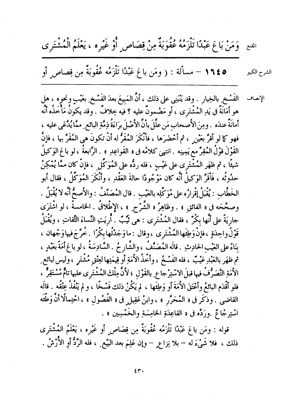 وَمَنْ بَاعَ عَبْدًا تَلْزَمُهُ عُقُوَبَةٌ مِنْ قِصَاصٍ أوْ غَيرِه، يَعْلَمُ الْمُشْتَرِي