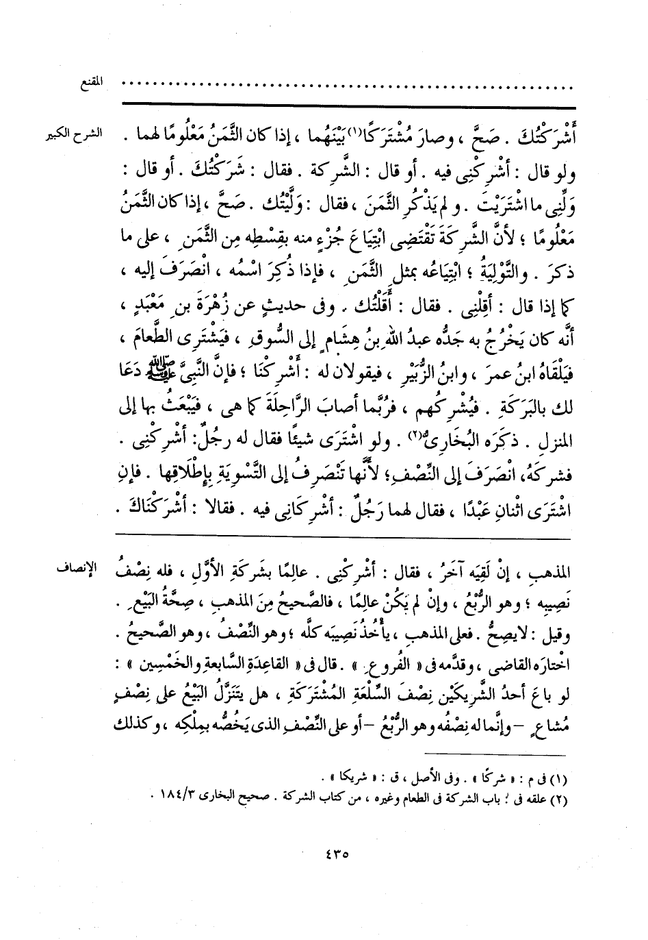 المذهبِ، إنْ لَقِيَه آخَرُ، فقال: أشْرِكْنِي. عالِمًا بشَركَةِ الأوَّلِ، فله نِصْفُ نَصِيبِه؛ وهو الرُّبْعُ، وإنْ لم يكُنْ عالِمًا، فالصَّحيحُ مِنَ المذهبِ، صِحَّةُ البَيعِ. وقيل: لا يصِحُّ. فعلى المذهبِ، يأْخُذُ نَصِيبَه كلَّه؛ وهو النِّصْفُ، وهو الصَّحيحُ. اخْتارَه القاضي، وقدَّمه في «الفُروع.». قال في «القاعِدَةِ السَّابعةِ والخَمْسِين»: لو باعَ أحدُ الشَّرِيكَين نِصْفَ السِّلْعَةِ المُشْتَرَكَةِ، هل يتَنَزَّلُ البيعُ علي نِصْفٍ مُشاعٍ -وإنَّما له نِصْفُه وهو الرُّبْعُ- أو على النِّصْفِ الذي يَخُصُّه بمِلْكِه، وكذلك