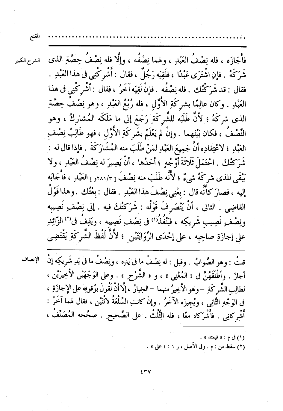 قلتُ: وهو الصَّوابُ. وقيل: له نِصْفُ ما في يَدِه، ونِصْفُ ما في يَدِ شَرِيكِه إنْ أجازَ. وأطْلَقَهُنَّ في «المُغْنِي»، و «الشرْحِ». وعلى الوَجْهَين الأخِيرَين، لطالِبِ الشَّرِكَةِ -وهو الأخِيرُ منهما- الخِيارُ، إلَّا أنْ نَقُولَ بوُقوفِه على الإِجازَةِ، في الوَجْهِ الثَّانِي، ويُجِيزَه الآخَرُ. وإنْ كانتِ السِّلْعَةُ لاثْنَين، فقال لهما آخَرُ: أَشْرِكانِي. فأَشْرَكاه معًا، فله الثُّلُثُ. على الصَّحيحِ. صحَّحه المُصَنِّفُ،