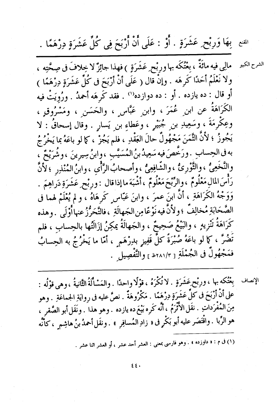 بِعْتُكه بها، ورِبْحِ عَشَرَةٍ. لا تُكْرَهُ، قوْلًا واحدًا. والمَسْأَلَةُ الثَّانيةُ، وهي قوْلُه: على أنْ أرْبَحَ في كلِّ عَشَرَةٍ دِرْهَمًا. مَكْرُوهَةٌ. نصَّ عليه في رِوايَةِ الجماعَةِ. وهو مِنَ المُفْرَداتِ. نقَل الأَثْرَمُ، أنَّه كَرِه بَيعَ ده يازده. وهو هذا. ونَقَل أبو الصَّقرِ، هو الرِّبا. واقْتَصَر عليه أبو بَكْرٍ في «زادِ المُسافِرِ». ونقَل أحمدُ بنُ هاشِمٍ، كأنَّه
