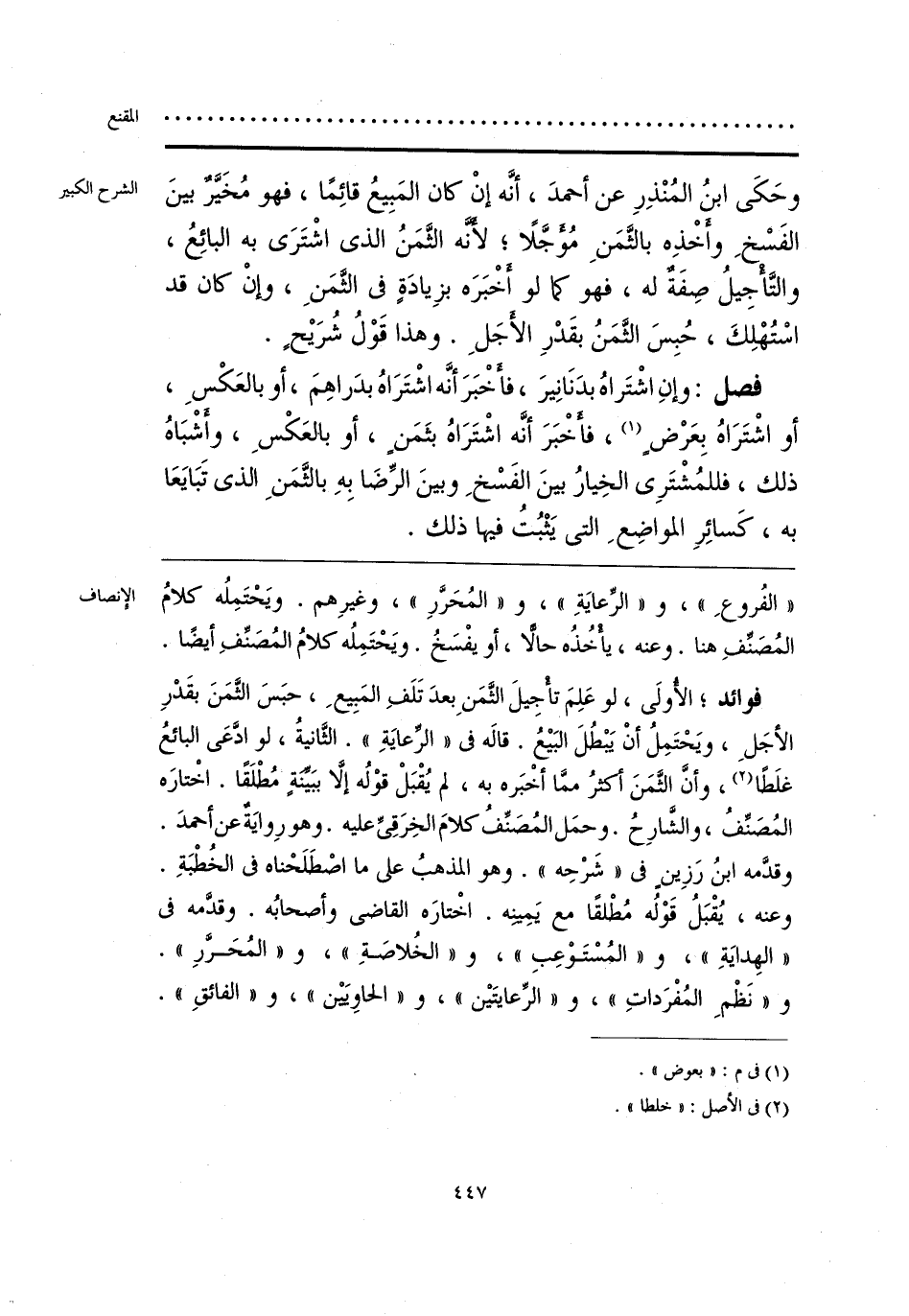 «الفُروعِ»، و «الرِّعايَةِ»، و «المُحَرَّرِ»، وغيرِهم. ويَحْتَمِلُه كلامُ المُصَنِّفِ هنا. وعنه، يأْخُذُه حالًّا، أو يفْسَخُ. ويَحْتَمِلُه كلامُ المُصَنِّفِ أيضًا.