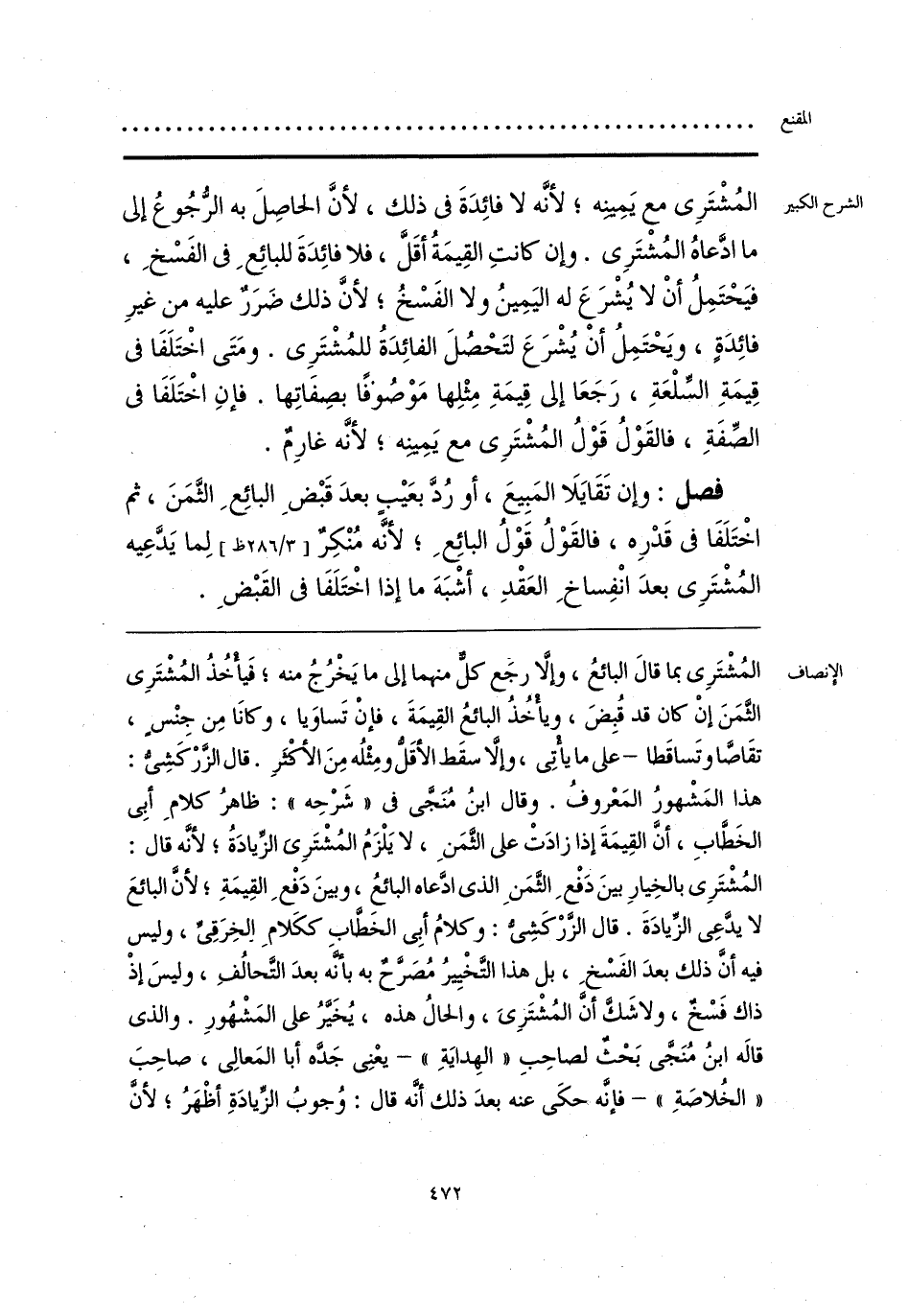 المُشْتَرِي بما قال البائعُ، وإلَّا رجَع كلٌّ منهما إلى ما يَخْرُجُ منه؛ فَيأْخُذُ المُشْتَرِي الثَّمَنَ إنْ كان قد قُبِضَ، ويأْخُذُ البائعُ القِيمَةَ، فإنْ تَساوَيا، وكانَا مِن جِنْسٍ، تقَاصَّا وتَساقَطا - على ما يأْتِي، وإلَّا سقَط الأقَلُّ ومِثْلُه مِنَ الأكْثَرِ. قال الزَّرْكَشِيُّ: هذا المَشْهورُ المَعْروفُ. وقال ابنُ مُنَجَّى في «شَرْحِه»: ظاهرُ كلامِ أبِي الخَطَّابِ، أنَّ القِيمَةَ إذا زادَتْ على الثَّمَنِ، لا يَلْزَمُ المُشْتَرِي الزِّيادَةُ؛ لأنَّه قال: المُشْتَرِي بالخِيارِ بينَ دَفْعِ الثَّمَنِ الذي ادَّعاه البائعُ، وبينَ دَفْعِ القِيمَةِ؛ لأنَّ البائعَ لا يدَّعِي الزِّيادَةَ. قال الزَّرْكَشِيُّ: وكلامُ أبِي الخَطَّابِ ككَلامِ الِخِرَقِيِّ، وليس فيه أنَّ ذلك بعدَ الفَسْخِ، بل هذا التَّخْيِيرُ مُصَرَّحٌ به بأنَّه بعدَ التَّحالُفِ، وليسَ إذْ ذاك فَسْخٌ، ولا شَكَّ أنَّ المُشْتَرِيَ، والحالُ هذه، يُخَيَّرُ على المَشْهُورِ. والذي قاله ابنُ مُنَجَّى بَحْثٌ لصاحِبِ «الهِدايَةِ» -يعْنِي جَدَّه أبا المَعالِي، صاحِبَ «الخُلاصَةِ» - فإنَّه حكَى عنه بعدَ ذلك أنَّه قال: وُجوبُ الزِّيادَةِ أظْهَرُ؛ لأنَّ