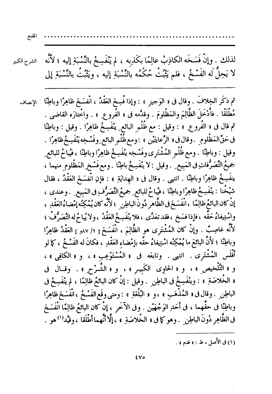 ثم ذكَر الخِلافَ. وقال في «الوَجيزِ»: وإذا فُسِخَ العَقْدُ، انْفسَخَ ظاهِرًا وباطنًا مُطْلَقًا. فأَدْخَلَ الظَّالِمَ والمَظْلومَ. وقدَّمه في «الفُرِوعِ». واخْتارَه القاضي. ثم قال في «الفُروعِ»: وقيل: مع ظُلْمِ البائعِ ينْفسِخُ ظاهِرًا. وقيل: وباطِنًا في حَقِّ المَظْلومِ. وقال في «الرِّعايتَين»: ومع ظُلْمِ البائعِ وفَسْخِه يَنْفَسِخُ ظاهِرًا. وقيل: وباطِنًا. ومع ظُلْمِ المُشْتَرِي وفَسْخِه ينْفَسِخُ ظاهِرًا وباطِنًا، فيُباحُ للبائعِ جميعُ التَّصَرُّفاتِ في المَبِيعِ. وقيل: لا ينْفَسِخُ باطِنًا. ومع فَسْخِ المَظْلومِ منهما، ينفَسِخُ ظاهِرًا وباطِنًا. انتهى. وقال في «الهِدايَةِ»: فإنِ انْفسَخَ العَقْدُ، فقال شيخُنا: ينْفَسِخُ ظاهِرًا وباطِنًا، فيُباحُ للبائعِ جميعُ التَّصَرُّفِ في المَبِيعِ. وعندي، إنْ كان البائعُ ظالِمًا، انْفَسَخَ في الظَّاهرِ دُونَ الباطِنِ؛ لأنَّه كان يُمْكِنُه إمْضاءُ العَقْدِ، واسْتِيفاءُ حَقِّه، فإذا فسَخ، فقد تعَدَّى، فلا ينْفَسِخُ العَقْدُ، ولا يُباحُ له التَّصَرفُ؛ لأنَّه غاصِبٌ. وإنْ كان المُشْتَرِي هو الظَّالِمَ، انْفَسَخَ العَقْدُ ظاهِرًا وباطِنًا؛ لأنَّ البائعَ ما يُمْكِنُه اسْتِيفاءُ حقِّه بإمْضاءِ العَقْدِ، فكانَ له الفَسْخُ, كما لو أفْلَس المُشْتَرِي. انتهى. وتابعَه في «المُسْتَوْعِب»، و «الكافِي»، و «التَّلْخيصِ»، و «الحاوي الكَبِيرِ»، و «الشَّرْحِ». وقال في «الخُلاصَةِ»: وينْفَسِخُ في الباطِنِ. وقيل: إنْ كان البائعُ ظالِمًا، لم ينْفَسِخْ في الباطِنِ. وقال في «المُذْهَبِ»، و «البُلْغَةِ»: ومتى وقَع الفَسْخُ، انْفَسَخَ ظاهِرًا وباطِنًا في حقِّهما، في أحَدِ الوَجْهَين. وفي الآخَرِ، إنْ كان البائعُ ظالِمًا انْفَسَخَ في الظَّاهِرِ دُونَ الباطِنِ. وهو كما في «الخُلاصَةِ»، إلَّا أنَّهما أطْلَقا، وقيَّد (¬1) هو.