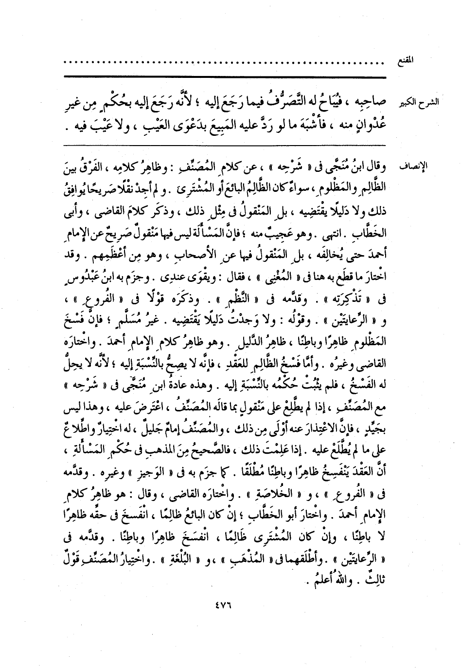 وقال ابنُ مُنَجَّى في «شَرْحِه»، عن كلامَ المُصَنِّفِ: وظاهِرُ كلامِه، الفَرْقُ بينَ الظَّالِمِ والمَظْلومِ، سواءٌ كان الظَّالِمُ البائعَ أو المُشْتَرِيَ. ولم أجِدْ نقْلًا صَريحًا يُوافِقُ ذلك ولا دَليلًا يقْتَضِيه، بلِ المَنْقولُ في مِثْلِ ذلك، وذكَر كلامَ القاضي، وأبي الخَطَّابِ. انتهى. وهو عَجِيبٌ منه؛ فإنَّ المَسْأَلَة ليس فيها مَنْقولٌ صَرِيحٌ عن الإِمامِ أحمدَ حتى يُخالِفَه، بلِ المَنْقولُ فيها عنِ الأصحابِ، وهو مِن أعْظَمِهم. وقد اخْتارَ ما قطَع به هنا في «المُغْنِي»، فقال: ويقْوَى عندِي. وجزَم به ابنُ عَبْدُوسٍ في «تَذْكِرَتِه». وقدَّمه في «النَّظْمِ». وذكَرَه قوْلًا في «الفُروعِ»، و «الرِّعايتَين». وقوْلُه: ولا وَجدْتُ دَليلًا يَقْتَضِيه. غيرُ مُسَلَّمٍ؛ فإنَّ فَسْخَ المَظْلومِ ظاهِرًا وباطِنًا، ظاهِرُ الدَّليلِ. وهو ظاهِرُ كلامِ الإِمامِ أحمدَ. واخْتارَه القاضي وغيرُه. وأمَّا فَسْخُ الظَّالِمِ للعَقْدِ، فإنَّه لا يصِحُّ بالنِّسْبَةِ إليه؛ لأنَّه لا يحِلُّ له الفَسْخُ، فلم يثْبُتْ حُكْمُه بالنِّسْبَةِ إليه. وهذه عادةُ ابنِ مُنَجَّى في «شَرْحِه» مع المُصَنِّفِ، إذا لم يطَّلِعْ على مَنْقولٍ بما قاله المُصَنِّفُ، اعْتَرضَ عليه، وهذا ليس بجَيِّدٍ، فإنَّ الاعْتِذارَ عنه أوْلَى مِن ذلك، والمُصَنِّفُ إمامٌ جَليلٌ، له اخْتِيارٌ واطِّلاعٌ على ما لم يُطَّلَعْ عليه. إذا عَلِمْتَ ذلك، فالصَّحيحُ مِنَ المذهبِ في حُكْمِ المَسْأَلةِ، أن العَقْدَ يَنْفَسِخُ ظاهِرًا وباطِنًا مُطْلَقًا. كما جزَم به في «الوَجيزِ» وغيرِه. وقدَّمه في «الفُروعِ»، و «الخُلاصَةِ». واخْتارَه القاضي، وقال: هو ظاهِرُ كلامِ الإِمامِ أحمدَ. واخْتارَ أبو الخَطَّابِ؛ إنْ كان البائعُ ظالِمًا، انْفَسخَ في حقِّه ظاهِرًا لا باطِنًا، وإنْ كان المُشْتَرِي ظَالِمًا، انْفسَخَ ظاهِرًا وباطِنًا. وقدَّمه في «الرِّعايتَين». وأطْلَقهما في «المُذْهَبِ»، و «البُلْغةِ». واخْتِيارُ المُصَنِّفِ قَوْلٌ ثالِثٌ. واللهُ أعلمُ.