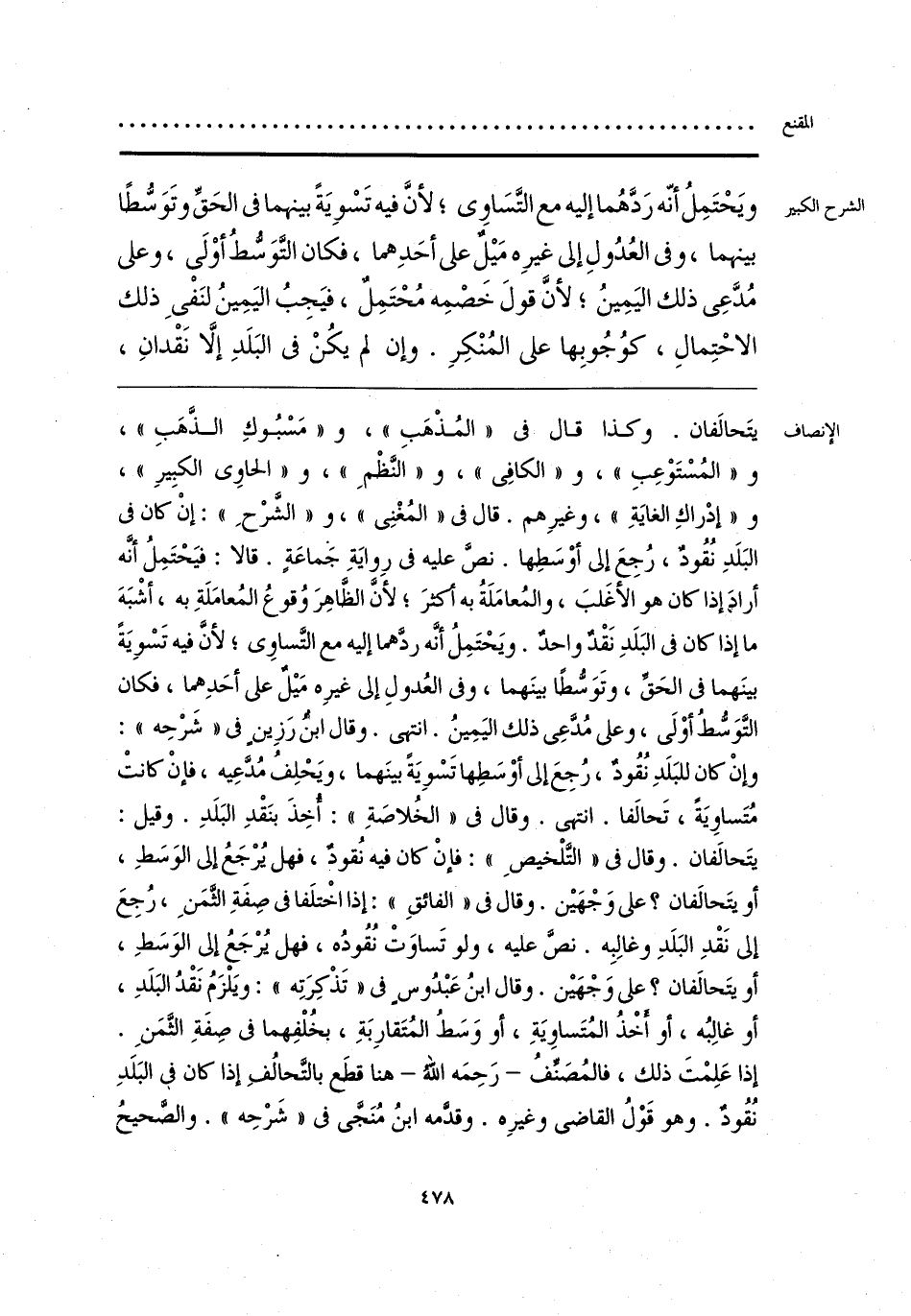 يتَحالفان. وكذا قال في «المُذْهَبِ»، و «مَسْبُوكِ الذَّهَبِ»، و «المُسْتَوْعِبِ»، و «الكافِي»، و «النَّظْمِ»، و «الحاوي الكبِيرِ»، و «إدْراكِ الغايَةِ»، وغيرِهم. قال في «المُغْنِي»، و «الشَّرْحِ»: إنْ كان في البَلَدِ نُقُودٌ، رُجِعَ إلى أوْسَطِها. نصَّ عليه في رِوايَةِ جَماعَةٍ. قالا: فيَحْتَمِلُ أنَّه أرادَ إذا كان هو الأغَلبَ، والمُعامَلَةُ به أكثرَ؛ لأنَّ الظَّاهِرَ وُقوعُ المُعامَلَةِ به، أشْبَهَ ما إذا كان في البَلَدِ نَقْدٌ واحدٌ. ويَحْتَمِلُ أنَّه ردَّهما إليه مع التَّساوي؛ لأنَّ فيه تَسْويَةً بينَهما في الحَقِّ، وتَوَسُّطًا بينَهما، وفي العُدولِ إلى غيرِه مَيلٌ على أحَدِهما، فكان التَّوَسُّطُ أوْلَى، وعلى مُدَّعِي ذلك اليَمِينُ. انتهى. وقال ابنُ رَزِينٍ في «شَرْحِه»: وإنْ كان للبَلَدِ نُقُودٌ، رُجِعَ إلى أوْسَطِها تَسْويَةً بينَهما، ويَحْلِفُ مُدَّعِيه، فإنْ كانتْ مُتَساويَةً، تَحالفا. انتهى. وقال في «الخُلاصَةِ»: أُخِذَ بنَقْدِ البَلَدِ. وقيل: يتَحالفان. وقال في «التَّلْخيصِ»: فإنْ كان فيه نُقودٌ، فهل يُرْجَعُ إلى الوَسَطِ، أو يتَحالفان؟ على وَجْهَين. وقال في «الفائقِ»: إذا اخْتلَفا في صِفَةِ الثَّمَنِ، رُجِعَ إلى نَقْدِ البَلَدِ وغالِبِه. نصَّ عليه، ولو تَساوَتْ نُقُودُه، فهل يُرْجَعُ إلى الوَسَطِ، أو يتَحالفان؟ على وَجْهَين. وقال ابنُ عَبْدُوسٍ في «تَذْكِرَتِه»: ويَلْزَمُ نَقْدُ البَلَدِ، أو غالِبُه، أو أَخْذُ المُتَساويَةِ، أو وَسَطُ المُتَقارِبَةِ، بخُلْفِهما في صِفَةِ الثَّمَنِ. إذا عَلِمْتَ ذلك، فالمُصَنِّفُ - رَحِمَه الله - هنا قطَع بالتَّحالُفِ إذا كان في البَلَدِ نُقُودٌ. وهو قَوْلُ القاضي وغيرِه. وقدَّمه ابنُ مُنَجَّى في «شَرْحِه». والصَّحيحُ