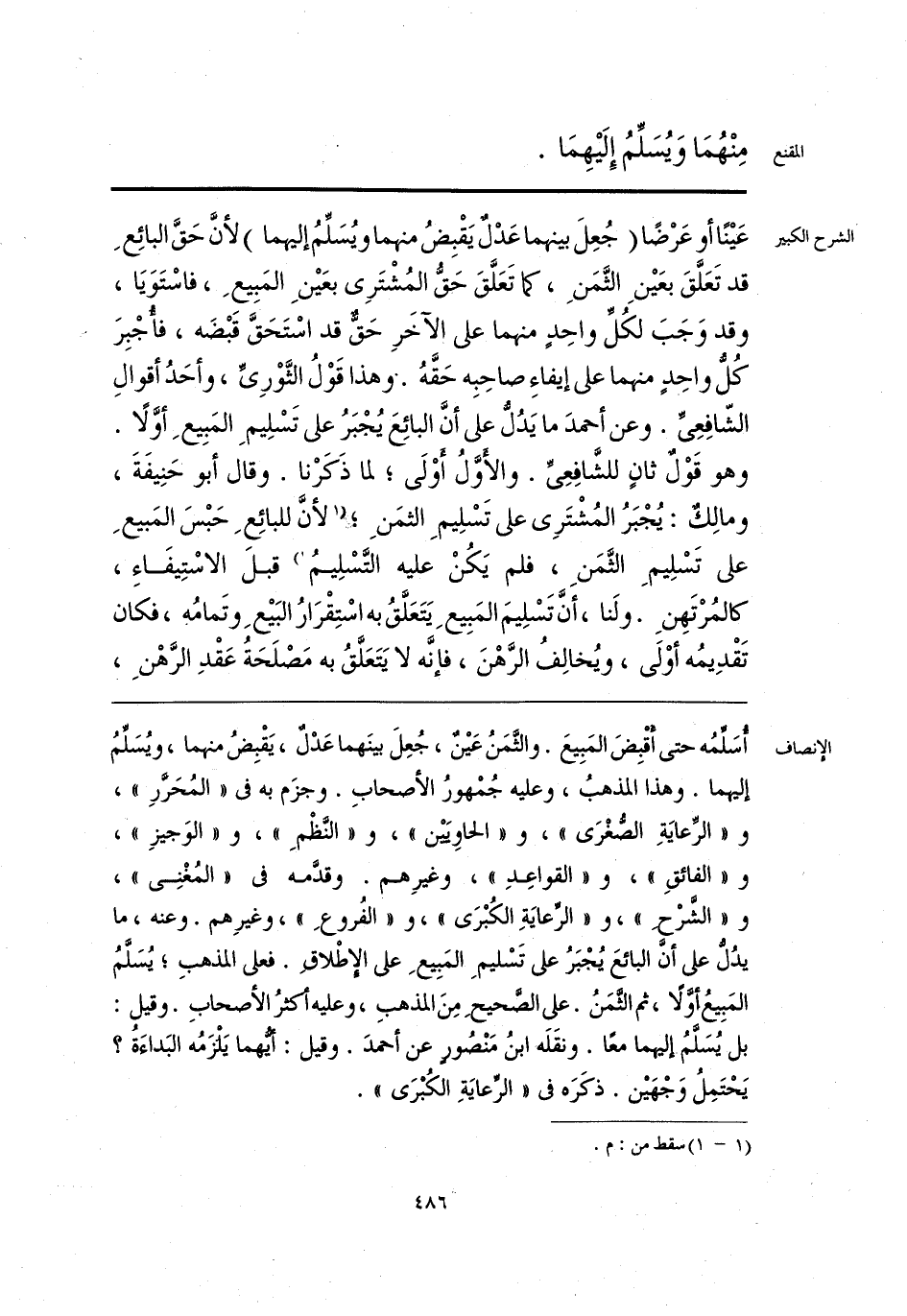 أُسَلِّمُه حتى أقْبِضَ المَبِيعَ. والثَّمَنُ عَينٌ، جُعِلَ بينَهما عَدْلٌ، يَقْبِضُ منهما، ويُسَلِّمُ إليهما. وهذا المذهبُ، وعليه جُمْهورُ الأصحابِ. وجزَم به في «المُحَرَّرِ»، و «الرِّعايَةِ الصُّغْرَى»، و «الحاويَين»، و «النَّظْمِ»، و «الوَجيزِ»، و «الفائقِ»، و «القواعِدِ»، وغيرِهم. وقدَّمه في «المُغْنِي»، و «الشَّرْحِ»، و «الرِّعايَةِ الكُبْرَى»، و «الفُروعِ»، وغيرِهم. وعنه، ما يدُلُّ على أنَّ البائعَ يُجْبَرُ على تَسْليمِ المَبِيعِ على الإِطْلاقِ. فعلى المذهبِ؛ يُسَلَّمُ المَبِيعُ أولًا، ثم الثَّمَنُ. على الصَّحيحِ مِنَ المذهبِ، وعليه أكثرُ الأصحابِ. وقيل: بل يُسَلَّمُ إليهما معًا. ونقَلَه ابنُ مَنْصُورٍ عن أحمدَ. وقيل: أيُّهما يَلْزَمُه البَداءَةُ؟ يَحْتَمِلُ وَجْهَين. ذكَرَه في «الرِّعايَةِ الكُبْرَى».