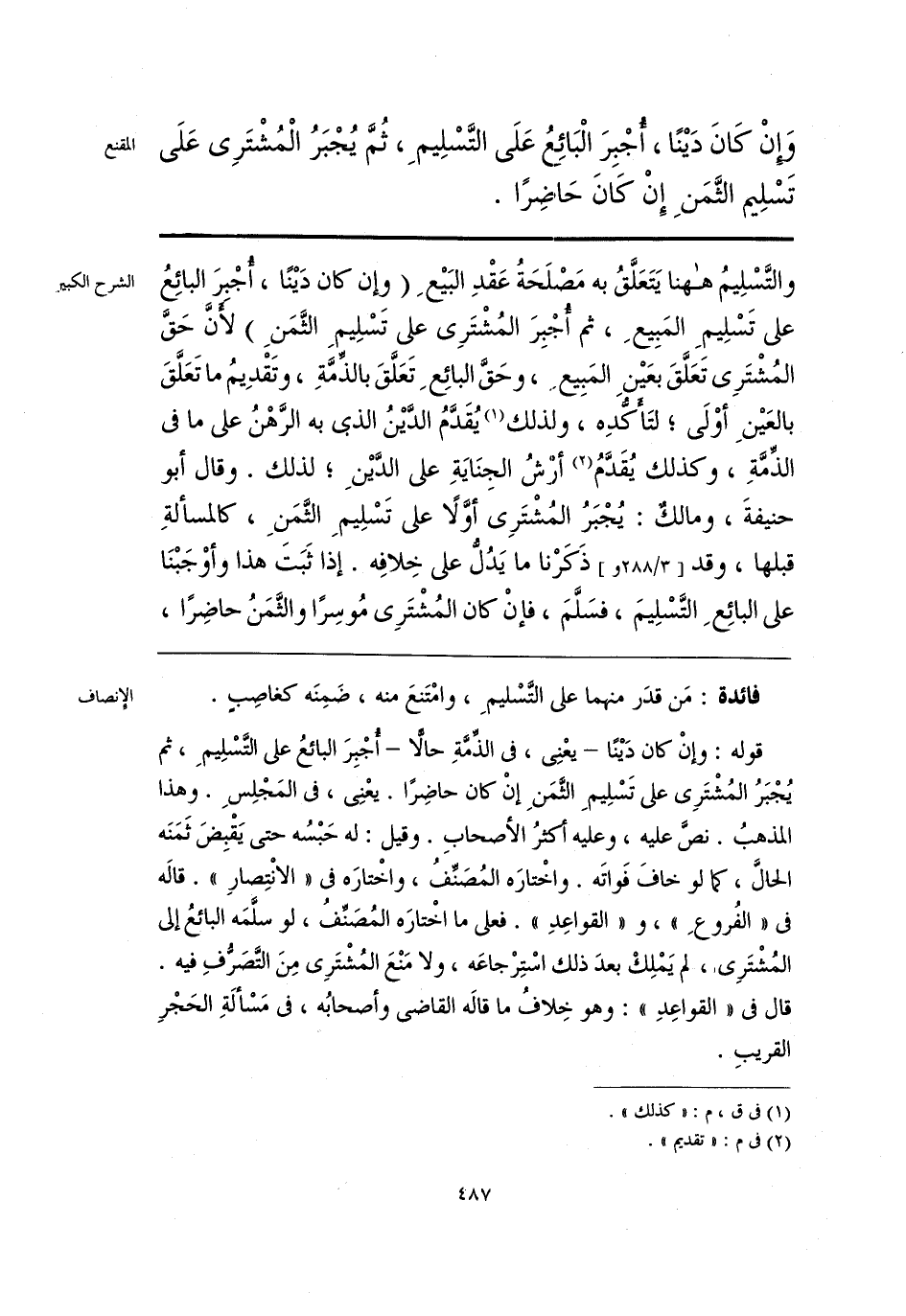 قوله: وإنْ كان دَينًا -يعْنِي، في الذِّمَّةِ حالًّا- أُجْبِرَ البائعُ على التَّسْلِيمِ، ثم يُجْبَرُ المُشْتَرِي على تَسْلِيمِ الثَّمَنِ إنْ كان حاضِرًا. يعْنِي، في المَجْلِسِ. وهذا المذهبُ. نصَّ عليه، وعليه أكثرُ الأصحابِ. وقيل: له حَبْسُه حتى يَقبِضَ ثَمَنَه الحالَّ، كما لو خافَ فَواتَه. واخْتارَه المُصَنِّفُ، واخْتارَه في «الانْتِصارِ». قاله في «الفُروعِ»، و «القواعِدِ». فعلى ما اخْتارَه المُصَنِّفُ، لو سلَّمَه البائعُ إلى المُشْتَرِي، لم يَمْلِكْ بعدَ ذلك اسْتِرْجاعَه، ولا مَنْعَ المُشْتَرِي مِنَ التَّصَرُّفِ فيه. قال في «القواعِدِ»: وهو خِلافُ ما قاله القاضي وأصحابُه، في مَسْألَةِ الحَجْرِ القريبِ.