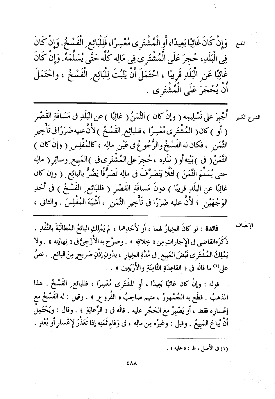 قوله: وإنْ كان غائبًا بَعِيدًا، أو المشْتَرِى مُعْسِرًا، فللبائعِ الفَسْخُ. هذا المذهبُ. قطَع به الجُمْهورُ، منهم صاحِبُ «الفُروعِ». وقيل: له الفَسْخُ مع إعْسارِه فقط، أو يَصْبِرُ مع الحَجْرِ عليه. قاله في «الرِّعايَةِ». وقال: ويَحْتَمِل أنْ يُباعَ المَبِيعُ. وقيل: وغيرُه مِن مالِه، في وَفاءِ ثَمَنِه إذا تَعَذَّرَ لإِعْسارٍ أو بُعْدٍ.