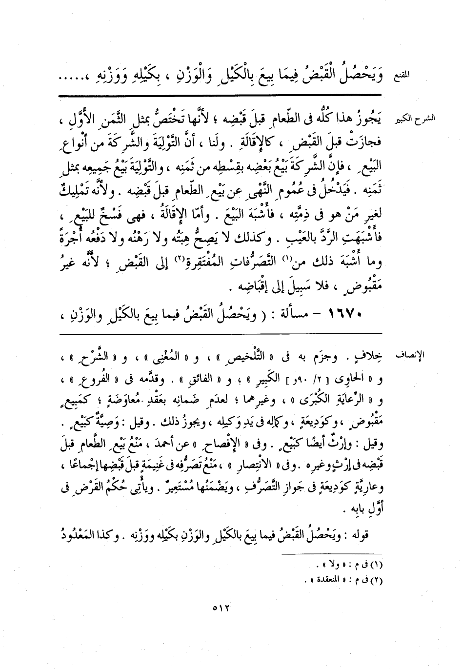 خِلافٍ. وجزَم به في «التَّلْخيصِ»، و «المُغْنِي»، و «الشَّرْحِ»، و «الحاوي الكَبِيرِ»؛ و «الفائقِ». وقدَّمه في «الفُروعِ»، و «الرِّعايَةِ الكُبْرَى»، وغيرِهما؛ لعدَمِ ضَمانِه بعَقْدِ مُعاوَضَةٍ؛ كمَبِيعٍ مَقْبُوضٍ، وكوَدِيعَةٍ، وكمالِه في يَدِ وَكيله، ويجوزُ ذلك. وقيل: وَصِيَّةٌ كبَيعٍ. وقيل: وإرْثٌ أيضًا كبَيع. وفي «الإفْصاحِ» عن أحمدَ، مَنْعُ بَيعِ الطعامِ قبلَ قَبْضِه في إرْثٍ وغيرِه. وفي «الانْتِصارِ»، مَنْعُ تَصَرُّفِه في غَنِيمَةٍ قبلَ قَبْضِها إجْماعًا، وعارِيَّةٍ كوَدِيعَةٍ في جَوازِ التَّصَرُّفِ، ويَضْمَنُها مُسْتَعِيرٌ. ويأتِي حُكْمُ القَرْضِ في أوَلِ بابِه.