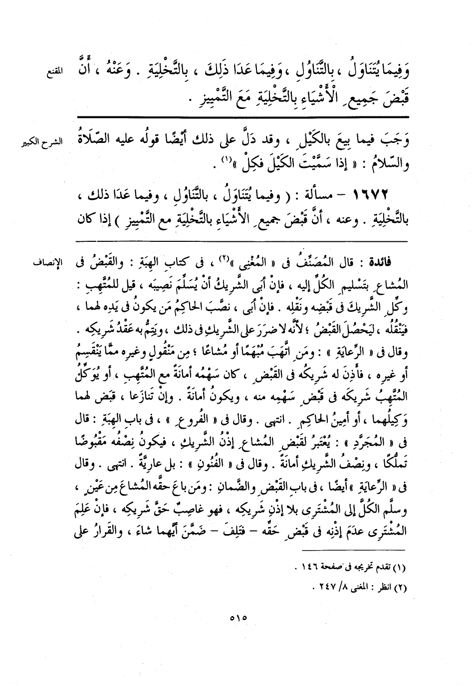 فائدة: قال المُصَنِّفُ في «المُغْنِي» (¬1)، في كتابِ الهِبَةِ: والقَبْضُ في المُشاعِ بتَسْليمِ الكُلِّ إليه، فإنْ أبي الشَّرِيكُ أنْ يُسَلِّمَ نَصِيبَه، قيل للمُتَّهِبِ: وكِّلِ الشَّرِيكَ في قَبْضِه ونَقْلِه. فإنْ أبي، نصبَ الحاكِمُ مَن يكونُ في يَدِه لهما، فيَنْقُلُه، ليَحْصُلَ القَبْضُ؛ لأنه لا ضرَرَ على الشَّرِيكِ في ذلك، ويَتِمُّ به عَقْدُ شَرِيكِه. وقال في «الرِّعايَةِ»: ومَنِ اتَّهَبَ مُبْهَمًا أو مُشاعًا؛ مِن مَنْقُولٍ وغيرِه مما يَنْقَسِمُ أو غيرِه، فأذِنَ له شَرِيكُه في القَبْضِ، كان سَهْمُه أمانَةً مع المُتَّهِبِ، أو يُوَكِّلُ المُتهِبُ شَرِيكَه في قَبْضِ سَهْمِه منه، ويكونُ أمانَةً. وإن تَنازَعا، قبَض لهما وَكِيلُهما، أو أمِينُ الحاكِمِ. انتهى. وقال في «الفُروعِ»، في بابِ الهِبَةِ: قال في «المُجَرَّدِ»: يُعْتَبرُ لقَبْضِ المُشاعِ إذْنُ الشَّرِيكِ، فيكونُ نِصْفُه مَقْبُوضا تَملُّكًا، ونِصْفُ الشَّرِيكِ أمانةً. وقال في «الفُنُونِ»: بل عارِيَّة. انتهى. وقال في «الرِّعايَةِ» أيضًا، في بابِ القَبْضِ والضَّمانِ: ومَن باعَ حقَّه المُشاعَ مِن عَينٍ، وسلَّم الكُلَّ إلى المُشْتَرِي بلا إذْنِ شَرِيكِه، فهو غاصِبٌ حَقَّ شَرِيكِه، فإنْ عَلِمَ المُشْتَرِي عدَمَ إذْنِه في قَبْضِ حَقِّه -فتَلِفَ- ضَمَّنَ أيَّهما شاءَ، والقَرارُ على