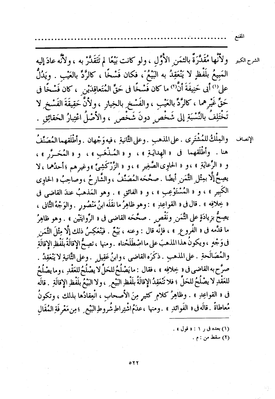 والمِلْكُ للمُشْتَرِب. على المذهبِ. وعلى الثانيةِ، فيه وَجْهان. وأطْلَقهما المُصَنِّفُ هنا. وأطْلَقهما في «الهِدايَةِ»، و «المُذْهَبِ»، و «المُحَرِّرِ»، و «الرِّعايَةِ»، و «الحاوي الصغِيرِ»، و «الزَّرْكَشِيِّ» وغيرِهم؛ أحدُهما، لا يصِحُّ إلَّا بمِثْلِ الثَّمَنِ أيضًا. صحَّحَه المُصَنِّفُ، والشارِحُ، وصاحِبُ «الحاوي الكَبِيرِ»، و «المُسْتَوْعِبِ»، و «الفائقِ». وهو المَذهبُ عندَ القاضي في «خِلافِه». قال في «القواعِدِ»: وهو ظاهِرُ ما نقَلَه ابنُ مَنْصُورٍ. والوَجْهُ الثاني، يصِحُّ بزِيادَةٍ على الثَّمَنِ ونَقْصٍ. صحَّحَه القاضي في «الرِّوايتَين». وهو ظاهِرُ ما قدَّمه في «الفُروعِ»، فإنَّه قال: وعنه، بَيعٌ. فيَنْعَكِسُ ذلك إلَّا مِثْلَ الثَّمَنِ في وَجْهٍ، ويكونُ هذا المذهبَ على ما اصطَلَحْناه. ومنها، تصِحُّ الإقالةُ بلَفْظِ الإقالةِ والمُصَالحةِ. على المذهبِ. ذكَرَه القاضي، وابنُ عَقِيلٍ. وعلى الثانيةِ لا يَنْعَقِدُ. صرَّح به القاضي في «خِلافِه»، فقال: ما يَصْلُحُ للحَلِّ لا يصْلُحُ للعَقْدِ، وما يصْلُحُ للعَقْدِ لا يصْلُحُ للحَلِّ؛ فلا تَنْعَقِدُ الإقالةُ بلَفْظِ البَيعِ، ولا البَيعُ بلَفْظِ الإقالةِ. قاله في «القواعِدِ». وظاهِرُ كلامِ كثير مِنَ الأصحابِ، انْعِقادُها بذلك، وتكونُ مُعاطاةً. قاله في «الفَوائدِ». ومنها، عدَمُ اشْتِراطِ شُروطِ البَيعِ؛ مِن مَعْرِفَةِ المُقَالِ