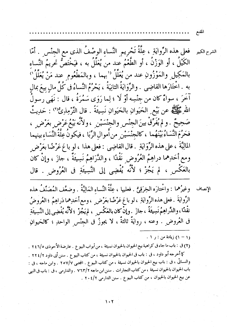 وغيرُهما: واخْتارَه الخِرَقِيُّ. فعليها، عِلَّةُ النَّساءِ المَالِيَّةُ. وضعَّف المُصَنِّفُ هذه الروايَةَ. فعلى هذه الرِّوايَةِ، لو باعَ عَرْضًا بعَرْض، ومع أحَدِهما دَراهِمُ؛ العُروضُ نقدًا، والدَّراهِمُ نَسِيئَة، جازَ. وإنْ كان بالعَكْسِ، لم يَجُزْ؛ لأنه يُفْضِي إلى النَّسِيئَةِ في العُروضِ. وعنه، رِوايَةٌ ثالثةٌ، لا يجوزُ في الجِنْسِ الواحدِ؛ كالحَيوانِ