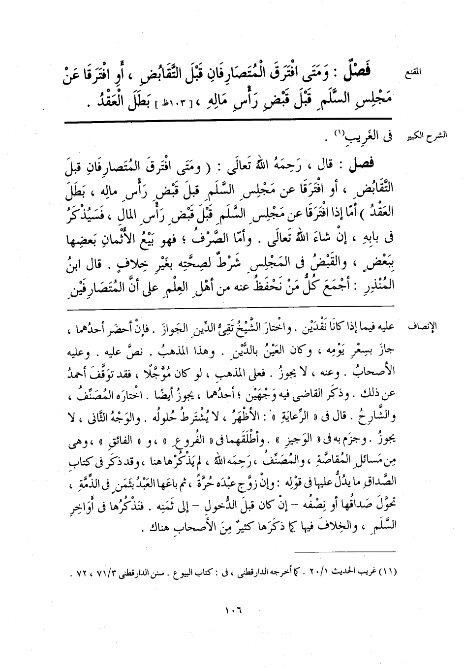 فَصْلٌ: وَمَتَى افْتَرَقَ الْمُتَصَارِفَانِ قَبْلَ التَّقَابُضِ، أَو افْتَرَقَا عَنْ مَجْلِسِ السَّلَمِ قَبْلَ قَبْضِ رَأْس مَالِهِ، بَطَلَ الْعَقْدُ.