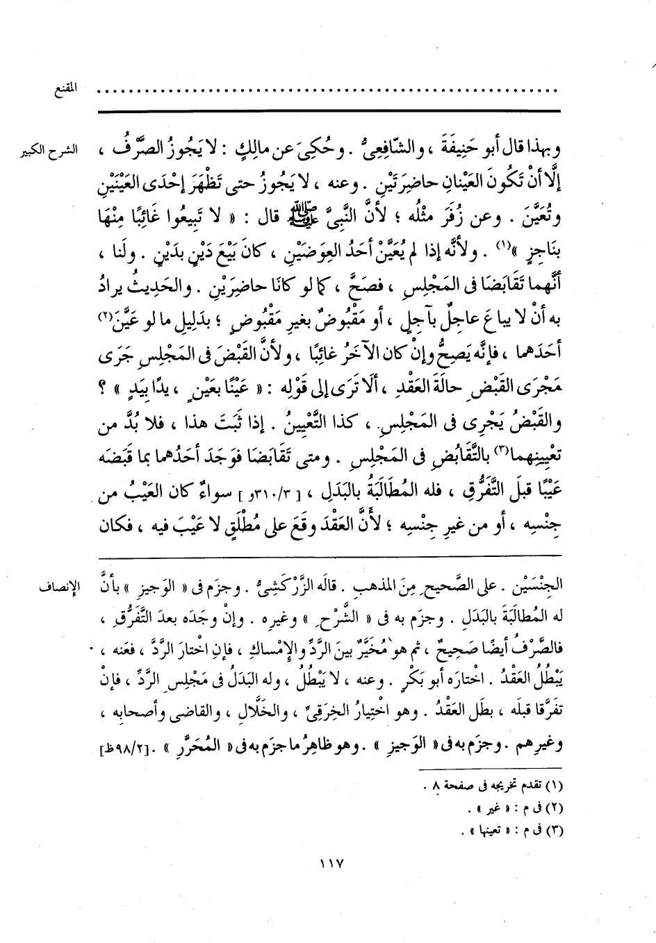 الجِنْسَين. على الصَّحيحِ مِنَ المذهبِ. قاله الزَّرْكَشِيُّ. وجزَم في «الوَجيزِ» بأنَّ له المُطالبَةَ بالبَدَلِ. وجزَم به في «الشَّرْحِ» وغيرِه. وإنْ وجَدَه بعدَ التَّفَرُّقِ، فالصَّرْفُ أيضًا صَحِيح، ثم هو مُخَيَّرٌ بينَ الرَّدِّ والإِمْساكِ، فإنِ اخْتارَ الرَّدَّ، فعَنه، يَبْطُلُ العَقْدُ. اخْتارَه أبو بَكْرٍ. وعنه، لا يَبْطُلُ، وله البَدَلُ في مَجْلِسِ الرَّدِّ، فإنْ تفَرَّقا قبلَه، بطَل العَقْدُ. وهو اخْتِيارُ الخِرَقِيِّ، والخَلَّالِ، والقاضي وأصحابِه، وغيرِهم. وجزَم به في «الوَجيزِ». وهو ظاهِرُ ما جزَم به في «المُحَررِ».