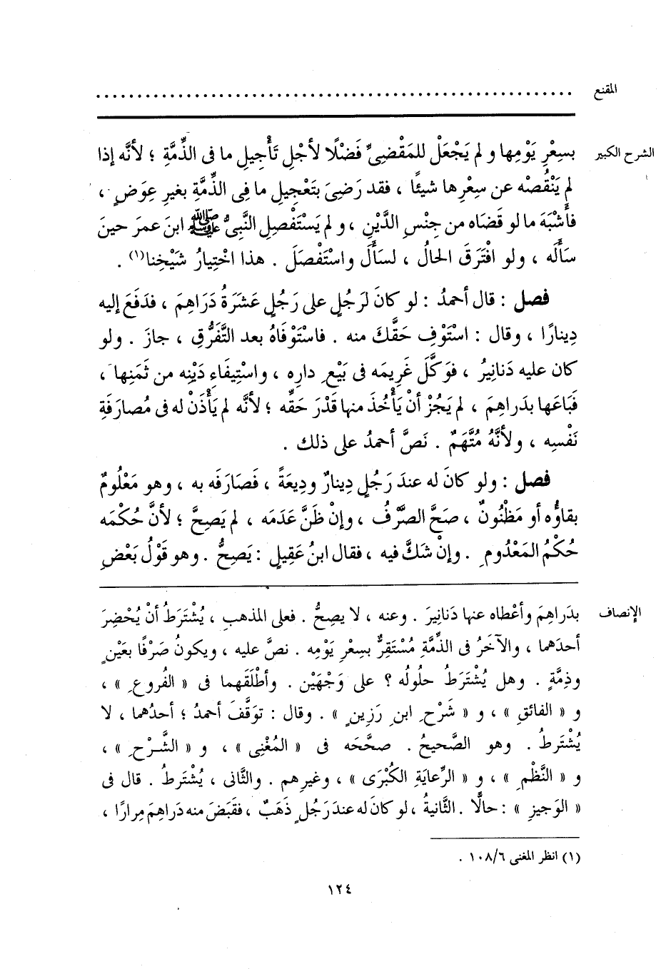 بدَراهِمَ وأعْطاه عنها دَنانِيرَ. وعنه، لا يصِحُّ. فعلى المذهبِ، يُشْتَرَطُ أنْ يُحْضِرَ أحدَهما، والآخَرُ في الذِّمَّةِ مُسْتَقِر بسِعْرِ يَوْمِه. نصَّ عليه، ويكونُ صَرْفًا بعَينٍ وذِمَّةٍ. وهل يُشْتَرَطُ حلُولُه؟ على وَجْهَين. وأطْلَقَهما في «الفُروعِ»، و «الفائقِ»، و «شَرْحِ ابنِ رَزِينٍ». وقال: توَقَّفَ أحمدُ، أحدُهما، لا يُشْتَرطُ. وهو الصَّحيحُ. صحَّحَه في «المُغْنِي»، و «الشَّرْحِ»، و «النَّظْمِ»، و «الرِّعايَةِ الكُبْرَى»، وغيرِهم. والثَّاني، يُشْتَرطُ. قال في «الوَجيزِ»: حالًّا. الثَّانيةُ، لو كانَ له عندَ رَجُلٍ ذَهَبٌ، فقَبَضَ منه دَراهِمَ مِرارًا،