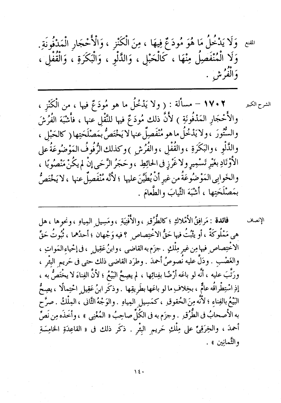 وَلَا يَدْخُلُ مَا هُوَ مودَعٌ فِيهَا، مِنَ الْكَنْزِ، وَالْأَحْجَارِ المدفُونَةِ. وَلَا الْمُنْفَصِلُ مِنْهَا، كَالْحَبْلِ، وَالدَّلْو، وَالْبَكَرَةِ، وَالْقُفْلِ، وَالْفُرُش.