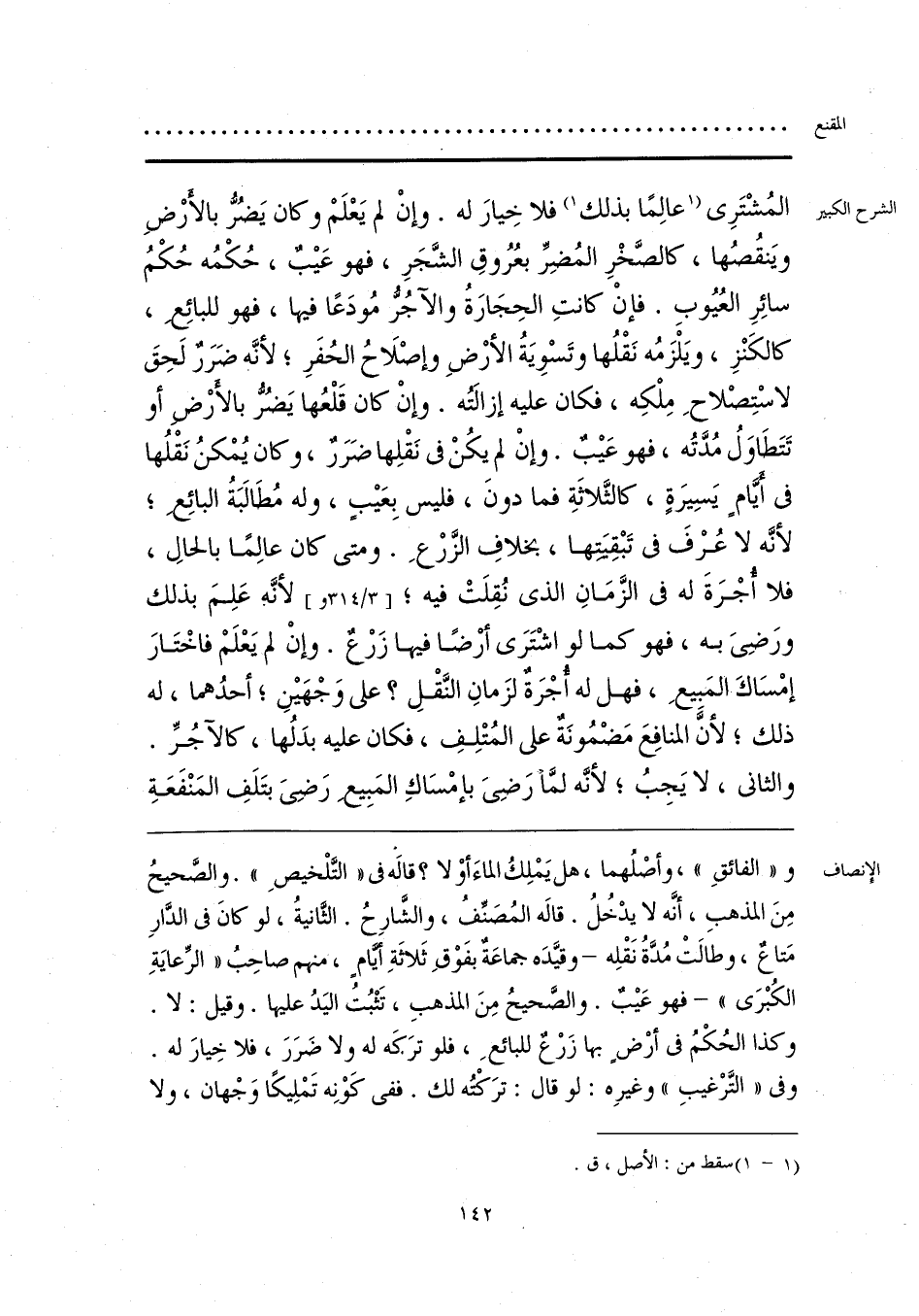 و «الفائقِ»، وأصْلُهما، هل يَمْلِكُ الماءَ أوْ لا؟ قاله في «التَّلْخيصِ». والصَّحيحُ مِنَ المذهبِ، أنَّه لا يدْخُلُ. قاله المُصَنِّفُ، والشَّارِح. الثَّانيةُ، لو كانَ في الدَّارِ مَتاع، وطالتْ مُدَّةُ نَقْلِه -وقيَّدَه جماعَةٌ بفَوْقِ ثَلاثةِ أيام، منهم صاحِبُ «الرِّعايَةِ الكُبْرَى» - فهو عَيبٌ. والصَّحيحُ مِنَ المذهبِ، تَثْبُتُ اليَدُ عليها. وقيل: لا. وكذا الحُكْمُ في أرْض بها زَرْعٌ للبائعِ، فلو ترَكه له ولا ضَرَرَ، فلا خِيارَ له. وفي «التَّرْغيبِ» وغيرِه: لو قال: ترَكْتُه لك. ففي كَوْنِه تَمْلِيكًا وَجْهان، ولا