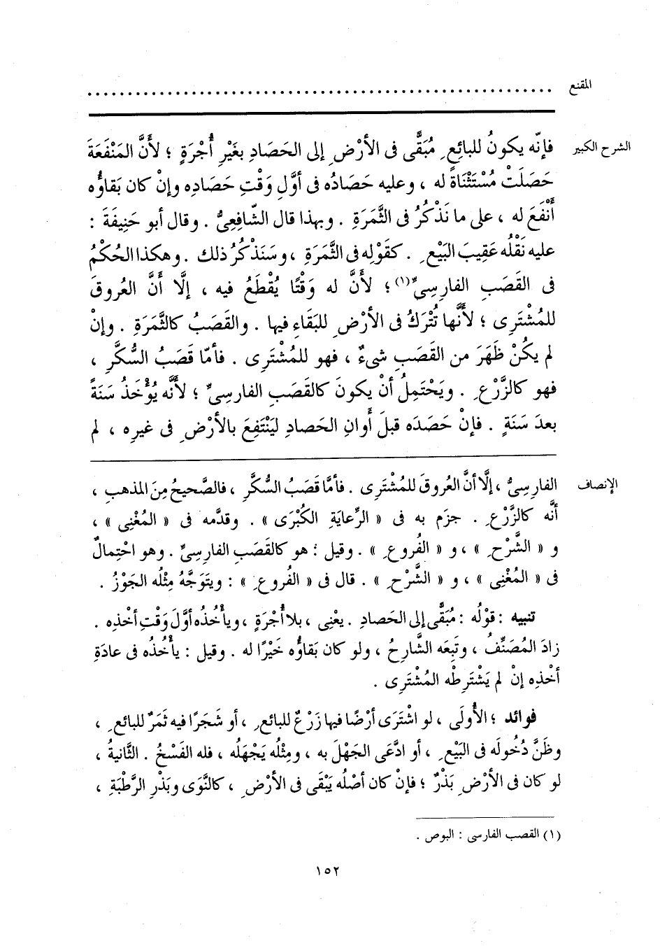 الفارِسِيُّ، إلا أنَّ العُروقَ للمُشْتَرِي. فأمَّا قَصَبُ السُّكَّرِ، فالصَّحيحُ مِنَ المذهبِ، أنَّه كالزرْعِ. جزَم به في «الرِّعايَةِ الكُبْرَى». وقدَّمه في «المُغْنِي»، و «الشَّرْحِ»، و «الفُروعِ». وقيل: هو كالقَصبِ الفارِسِي. وهو احْتِمال في «المغْنِي»، و «الشَّرْحِ». قال في «الفُروع»: ويتَوَجَّهُ مِثْلُه الجَوْزُ.