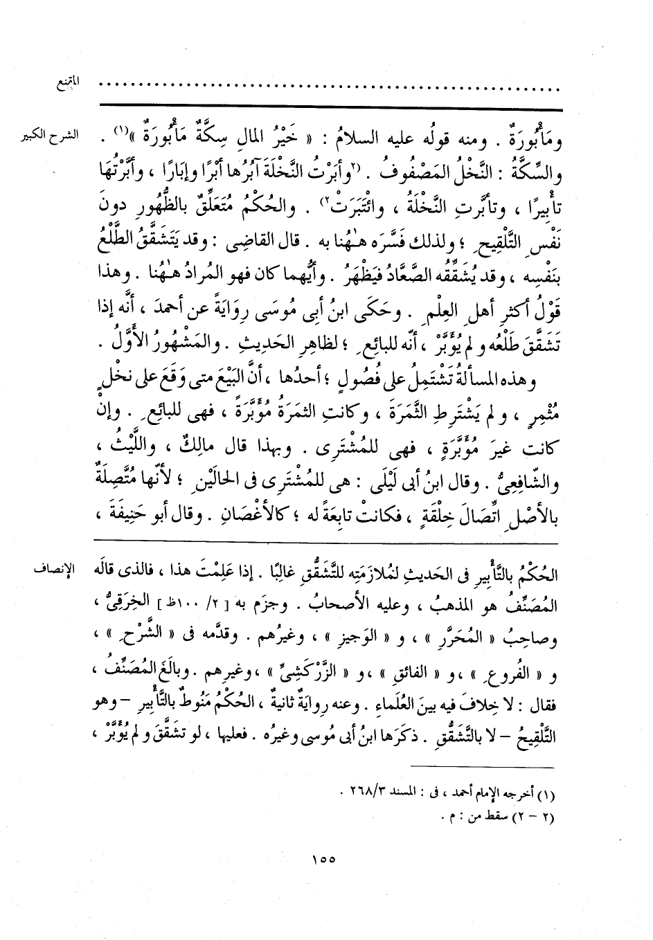 الحُكْمُ بالتَّأبِيرِ في الحَديثِ لملازَمَتِه للتَّشَقُّقِ غالِبًا. إذا عَلِمْتَ هذا، فالذي قاله المُصَنِّفُ هو المذهبُ، وعليه الأصحابُ. وجزَم به الخِرَقِيُّ، وصاحِبُ «المُحَرَّر»، و «الوَجيزِ»، وغيرُهم. وقدَّمه في «الشرْحِ»، و «الفُروعِ»، و «الفائقِ»، و «الزَّرْكَشِيِّ»، وغيرِهم. وبالغَ المُصَنِّفُ، فقال: لا خِلافَ فيه بينَ العُلَماءِ. وعنه رِوايَة ثانية، الحُكْمُ مَنُوطٌ بالتَّأبِيرِ -وهو التَّلْقِيحُ- لا بالتَّشَقُّقِ. ذكَرَها ابنُ أبي مُوسى وغيرُه. فعليها، لو تشَقَّقَ ولم يُؤبَّرْ،