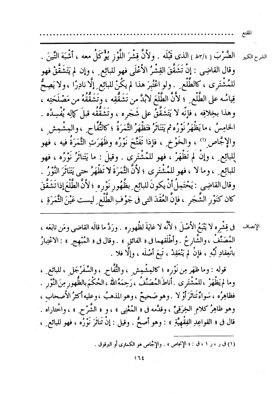 قوله: وما ظهَر مِن نَوْرِه؛ كالمِشْمِشِ، والتُّفَّاحِ، والسَّفَرْجَلِ، للبائعِ، وما لم يَظْهَرْ، للمُشْتَرِي. أناطَ المُصَنِّفُ، رَحِمَهُ الله، الحُكْمَ بالظهورِ مِنَ النَّوْرِ. فظاهِرُه، سَواءٌ تَناثَرَ أوْ لا. وهو صَحيح، وهو المذهبُ، وعليه أكثرُ الأصحابِ، وهو ظاهِرُ كلامِ الخِرَقِيِّ، وقدَّمه في «المُغْنِي»، و «الشَّرْحِ»، واخْتاراه. قال في «القواعِدِ الفِقْهِيّةِ»: وهو أصحُّ. وقيل: إنْ تَناثَرَ نَوْرُه، فهو للبائعِ،